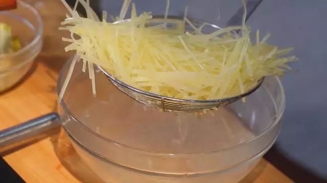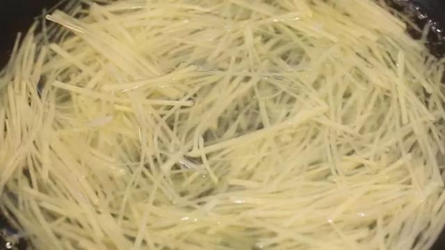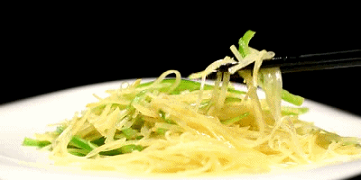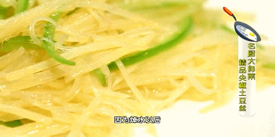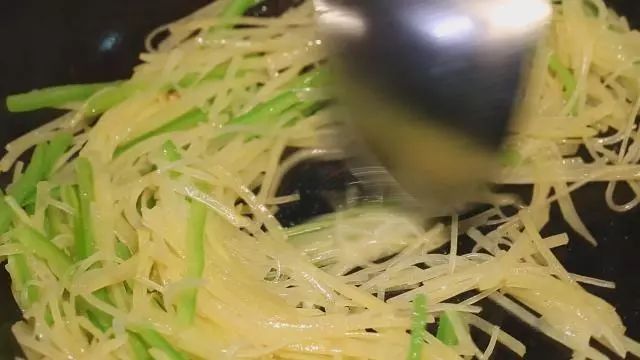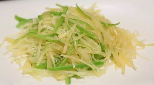 原理:土豆丝迅速的焯水以后,形成半透明状,通过煸炒让另外一半快速成熟,这样炒出来的土豆丝才清脆可口。