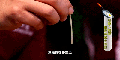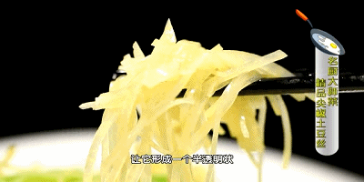 何亮大厨:把土豆丝搁在手里面一转,就可以完全转起来,如下图所示即可: