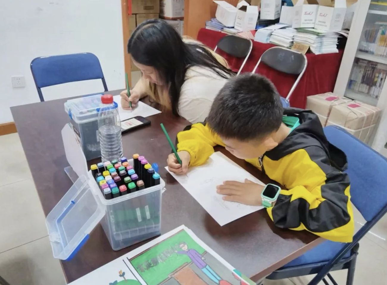 过程中,志愿服务的指导老师为孩们讲解了构图的美感、人物的塑造、色彩搭配等绘画知识,课堂讲解既生动又专业,为了让孩子们都能画出合格参展的绘画作品,老师耐心的为每一位孩子细心讲解、指导、答疑,家长和孩子们也很珍惜这次机会,亲子配合一起制作画作。
