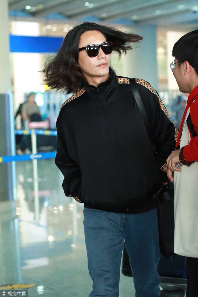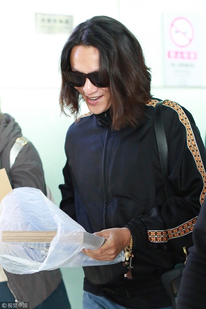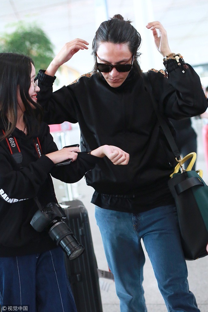 他穿着简单低调,自玩“回眸杀”耍帅,狂甩飘逸长发似邋遢大妈,机场找女粉借皮筋绑小辫超接地气。