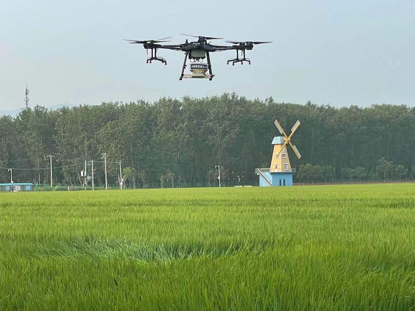 这是在海淀首次应用无人机释放天敌昆虫——稻螟赤眼蜂防治水稻虫害。