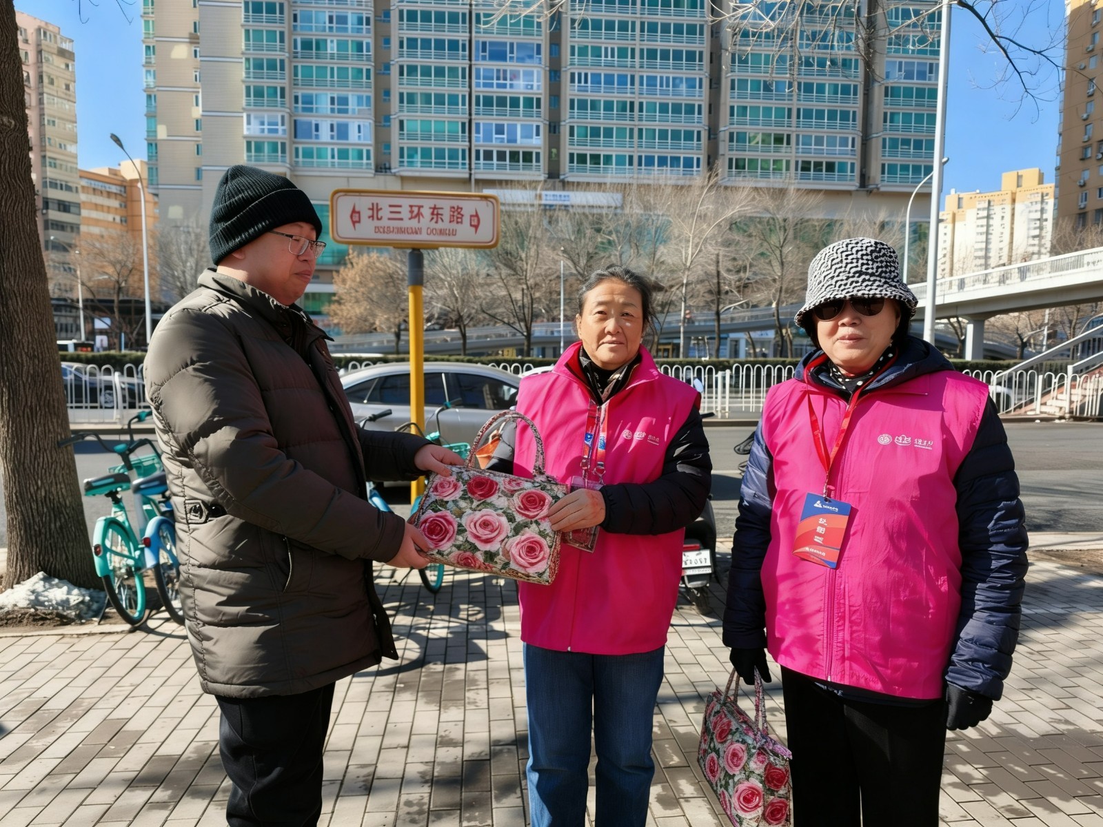 活动最后,社区工作人员带着居民亲手制作的帆布包,前往两会值守岗位,为一线巾帼志愿者送上节日问候,以手作温情致敬坚守与奉献。