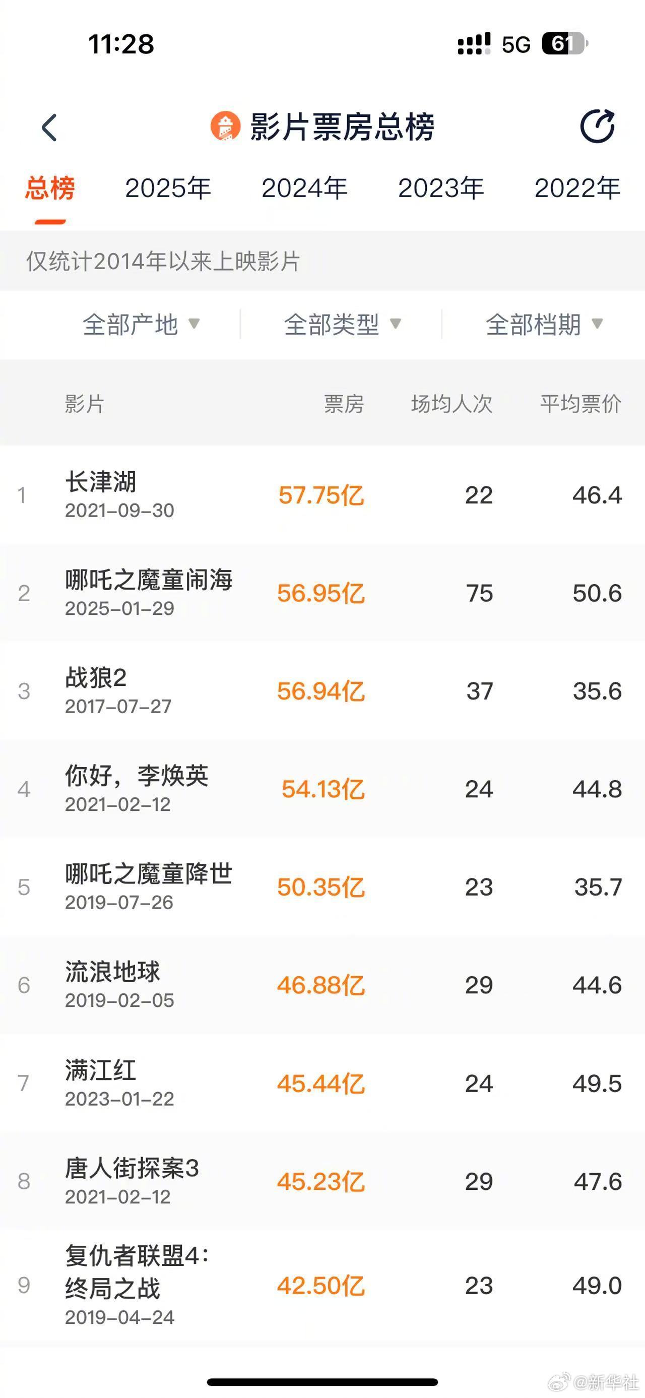 据网络平台数据(灯塔专业版),《哪吒之魔童闹海》总票房(含点映及预售)超过《战狼2》,位列中国影史票房第2位。