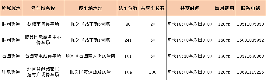 今年以来,顺义区城市管理委结合市民需求,挖潜既有停车位资源,在钱粮市集停车场、顺鑫国际商务中心停车场、石园充电站停车场、北京益麒麟家具建材广场停车场开放了220个错时共享停车位,缓解周边小区夜间停车位紧张问题,优化静态交通环境。