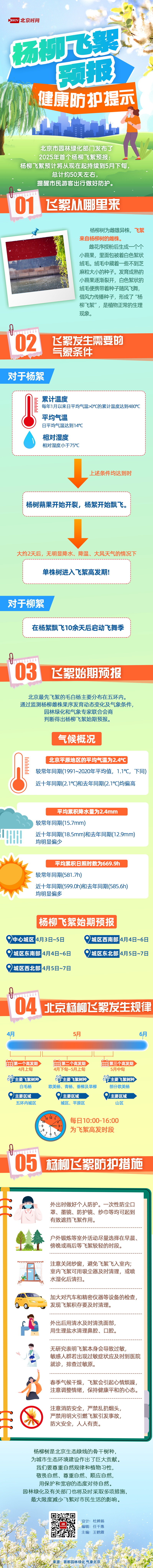近日,北京市园林绿化部门发布了2025年首个杨柳飞絮预报:杨柳飞絮预计将从现在起持续到5月下旬,总计约50天左右,提醒市民游客出行做好防护。飞絮是如何产生的?又在何时达到高峰?易过敏人群如何防护?收好这份“飞絮预报防护手册”,让你远离“毛茸茸”的烦恼! #2025北京飞絮预报防护手册# #北京杨柳飞絮预计将持续约50天#