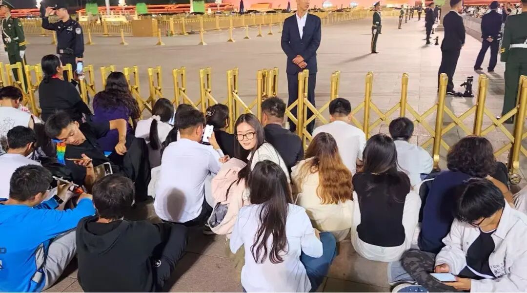 大学生们考完试专程赶来,席地而坐整理书包;有的家庭带着折叠垫早早占位,小女孩不时踮脚望向广场方向。人群中,国旗贴纸、小国旗随处可见,陌生人间分享着小马扎、热水与零食,等候时光暖意融融。