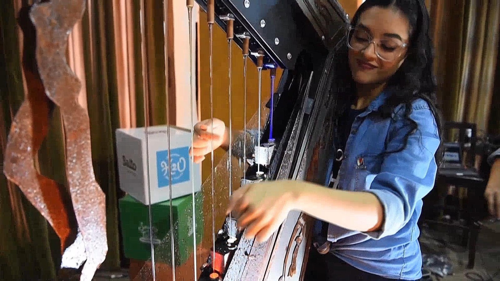 不过,这水流的声音并不是来自于环境录音,而是音乐家手中的竖琴发出的。这款独特的“水竖琴”虽然看上去与普通竖琴大同小异,但实际上使用了电声乐器的发声原理。充当琴弦的水流连接着压力传感器。当演奏者的手指划过水流,传感器感受到压力变化便会触发相应的电信号,电信号随后又会触发不同的音高。