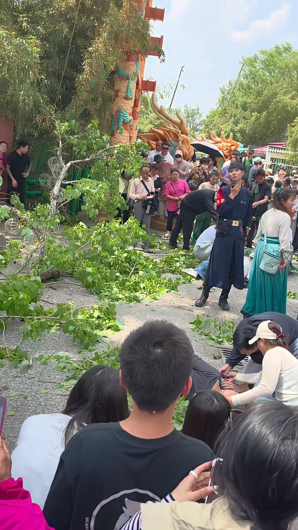 4月18日,多名网友发布视频称,河南开封万岁山武侠城景区内,树干突然倒了,有游客被砸伤。有游客称,现场有游客头部受伤。视频中还有人大声询问“有没有学过急救的游客?”