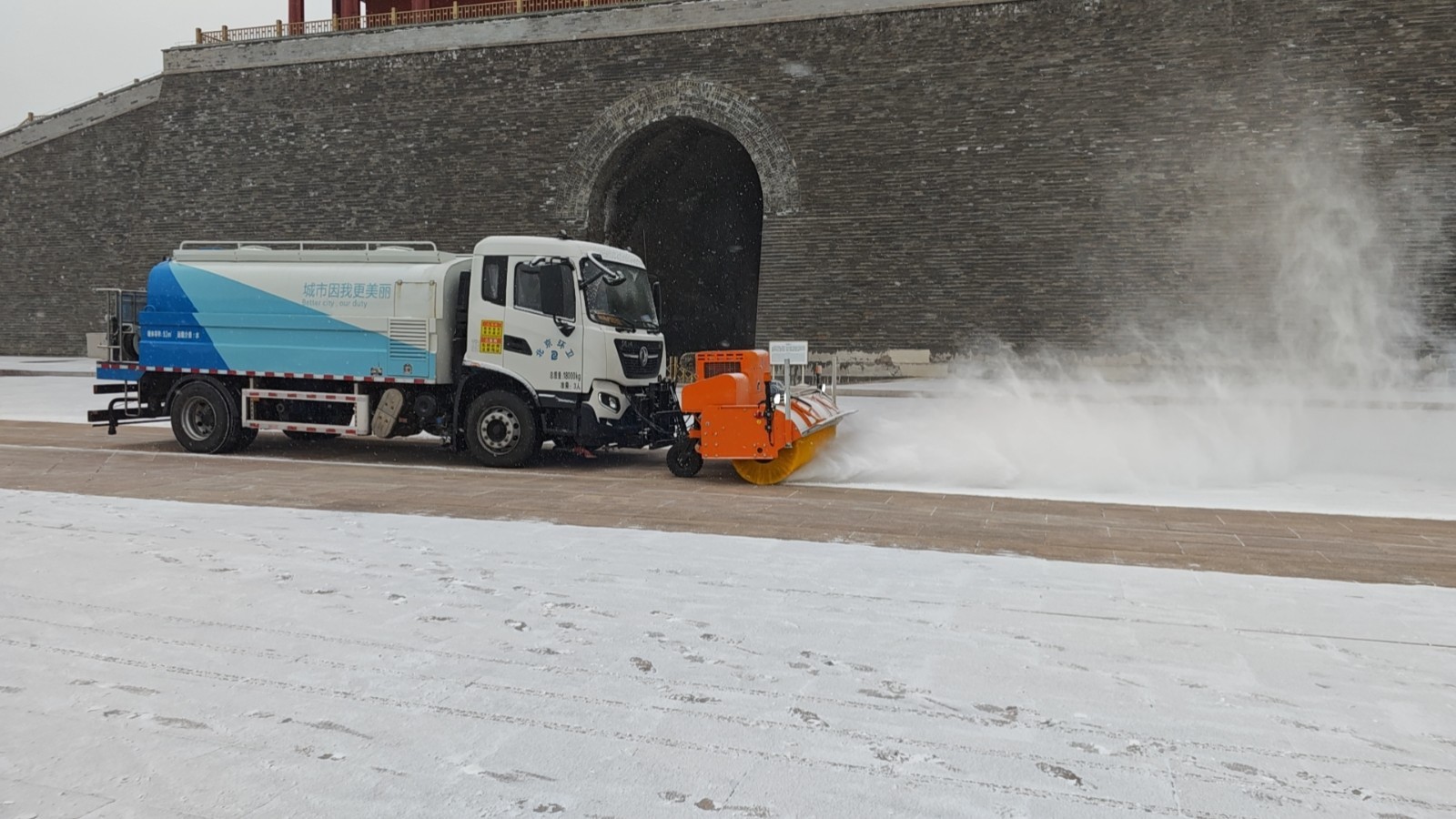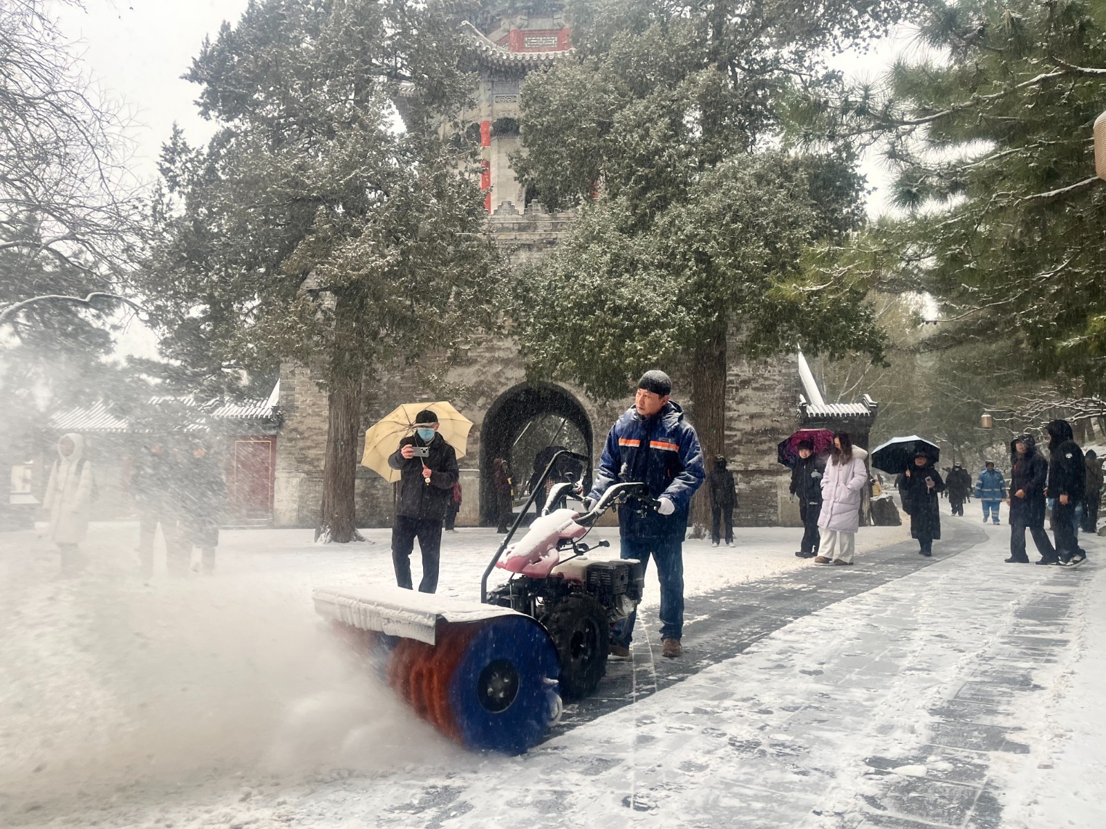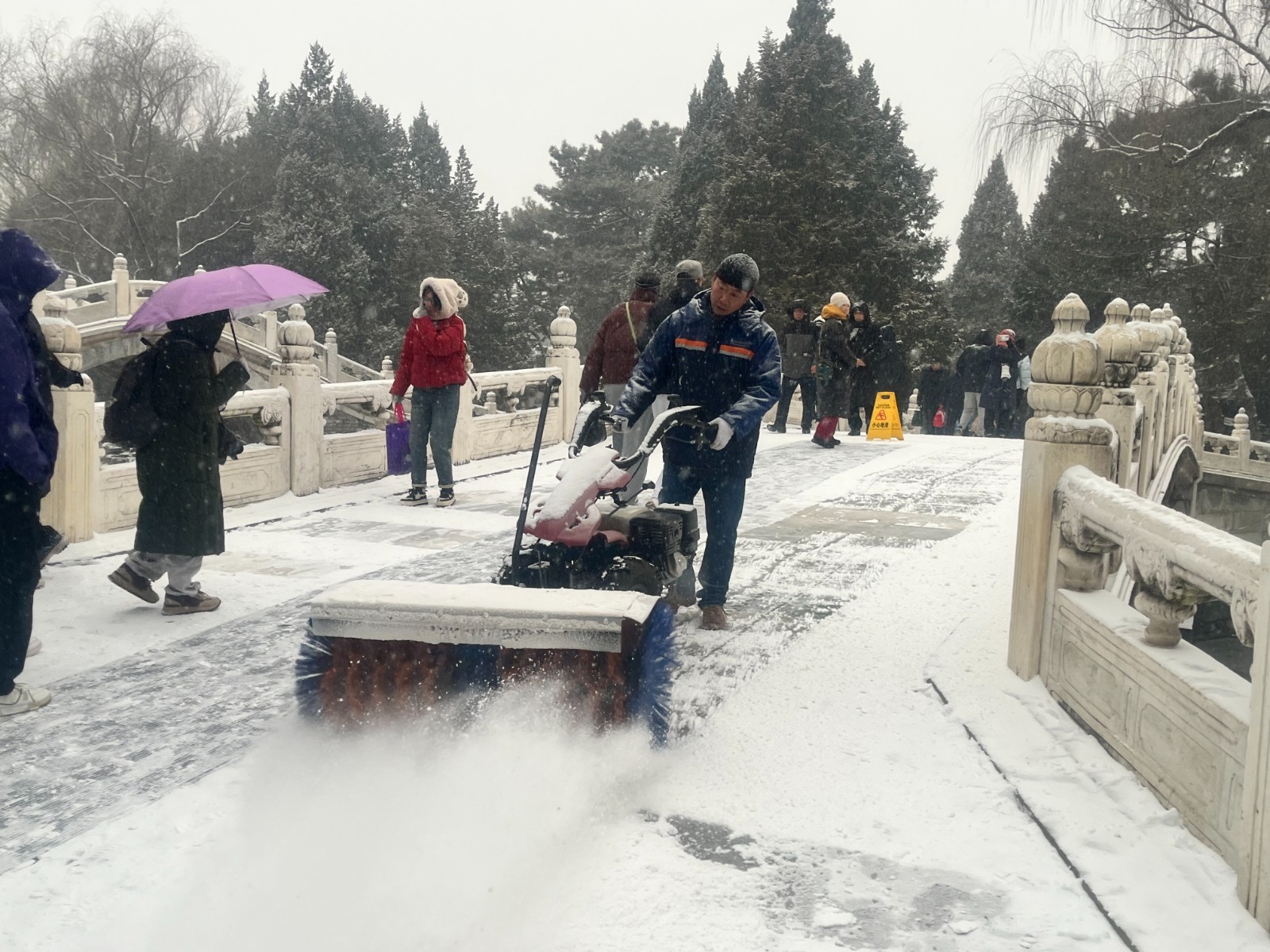 在广场公园区域,其中天安门广场区域,严格执行“雪下即扫,随下随扫”原则,利用大型扫雪设备优先开辟游客通行通道;其余公园、广场则采用小型设备或人工清扫,快速打通行人通道达到雪中慢行标准,注意留住优美雪景,积雪就近疏导至空地、绿地自然消融,最大限度保护绿化生态。