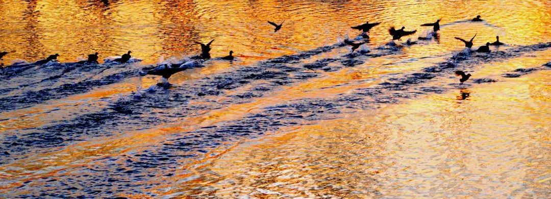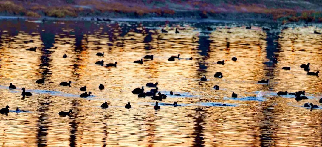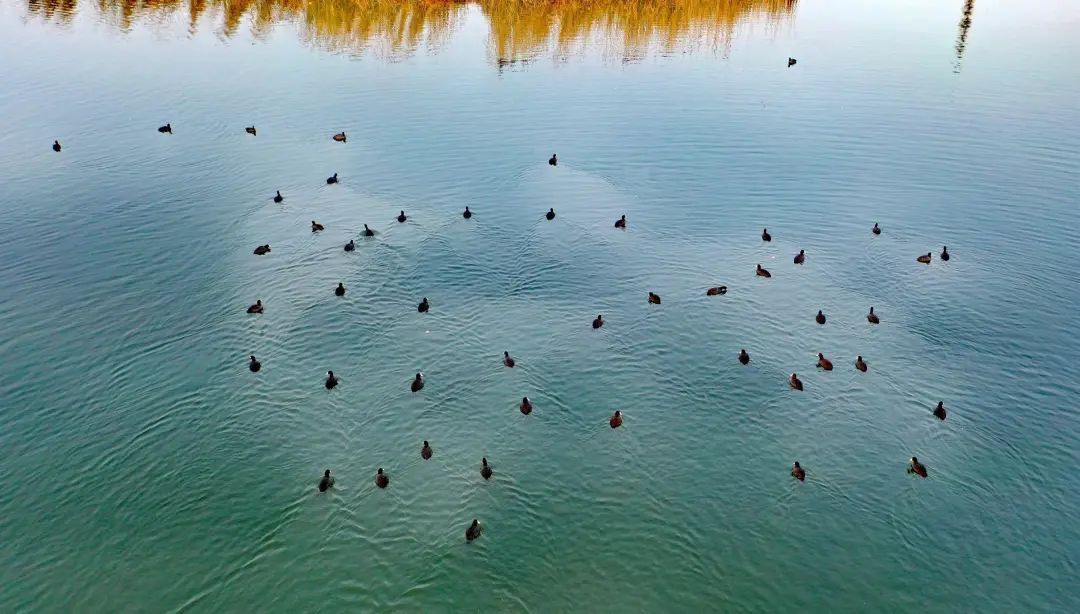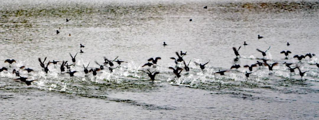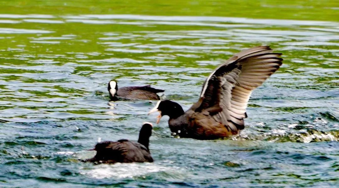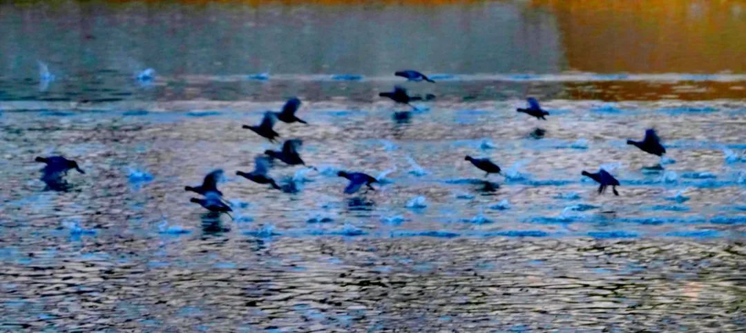 在长阳镇公议庄桥北两河的交界处,靠近河两岸的冰还未完全消融。河中央的水面上,聚集着一群群白骨顶鸡。它们的额头和尖尖的嘴是白色的,与浑身乌黑的羽毛形成鲜明的对比。这群可爱的“小精灵”穿梭在稀疏的芦苇丛间,发现有人靠近时,便迅速潜入水中,不一会儿又缓缓浮上水面。它们时而成群的振翅低飞,翅膀在轻点河水的瞬间,身后留下如珍珠般涟漪,成为冬季一道靓丽的风景。