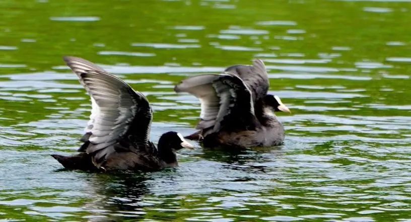 白骨顶鸡属鹤形目秧鸡科的鸟类,善游泳,能潜水捕食水草和小鱼,以植物为食,也吃昆虫蠕虫。游泳时头前后摆动尾部下垂,遇有危险能较长时间潜水躲避天敌。