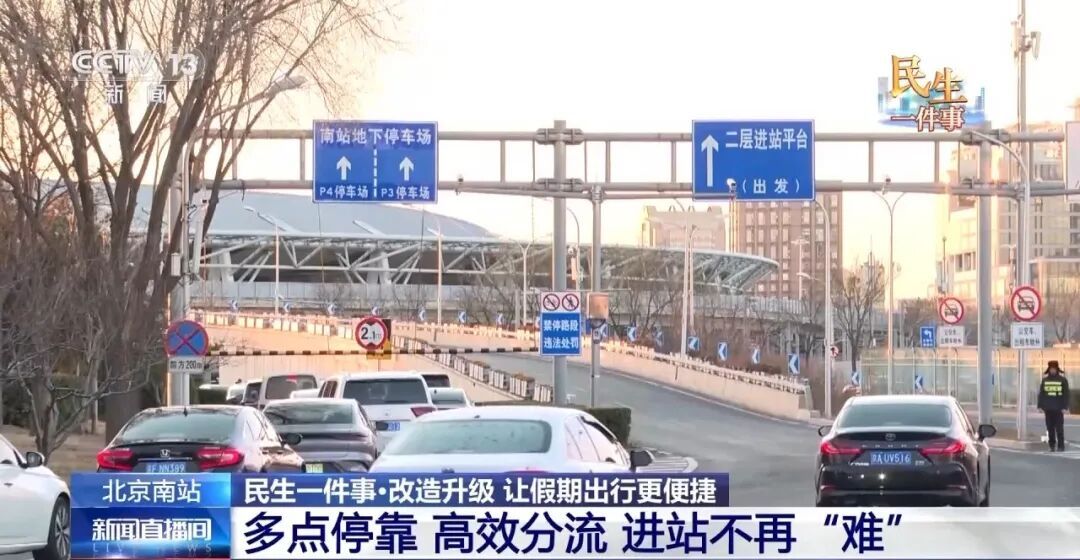 据介绍,自2025年11月24日7时起,北京南站路南广场路段新增了出租车专用落客功能实现“即停即走”,有效分流二层平台车流;而在站区的东南三角地块,还开辟了临时蓄车区,在车流量较大时会开启,进一步缓解交通压力;此外,新增的两条蓄车通道也在规划建设中。
