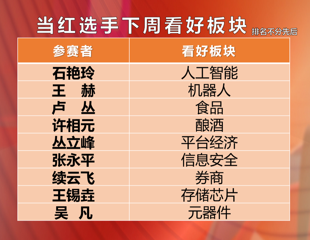 《当红不让》这是我们节目推出的一档虚拟炒股比赛,目的是为观众展示实战高手的选股能力,传授夺冠“一招鲜”。我们的比赛规则是周一选股周五结算,以参赛股当周的最大涨幅排名,每季度会末位淘汰两名选手。