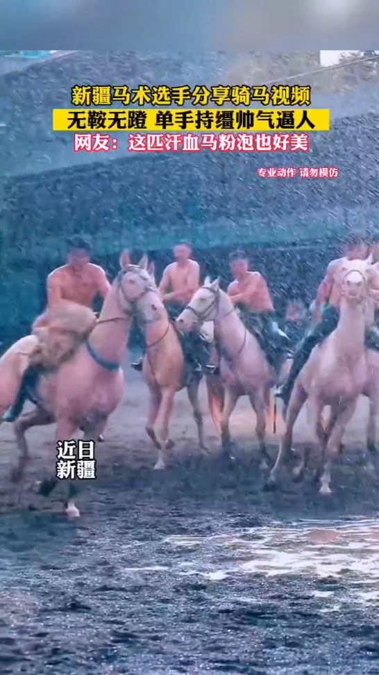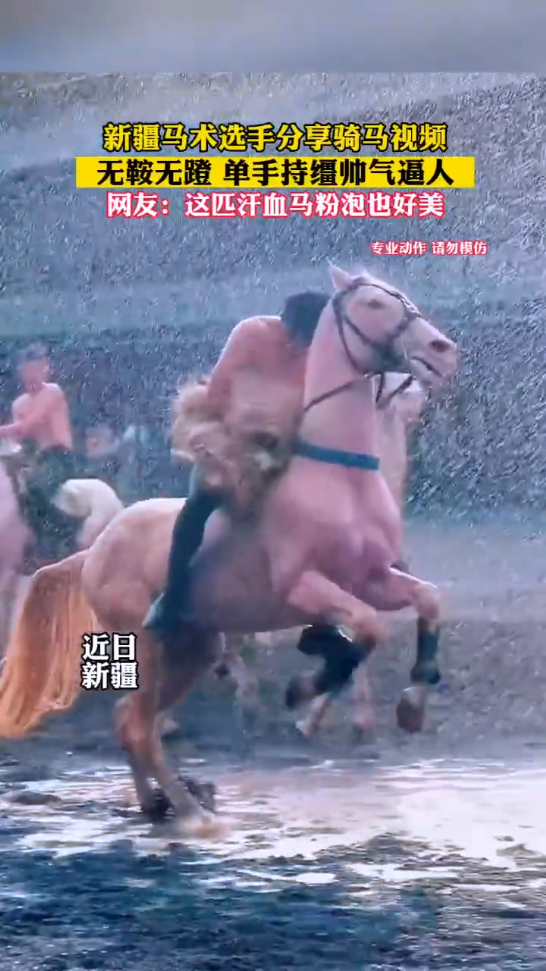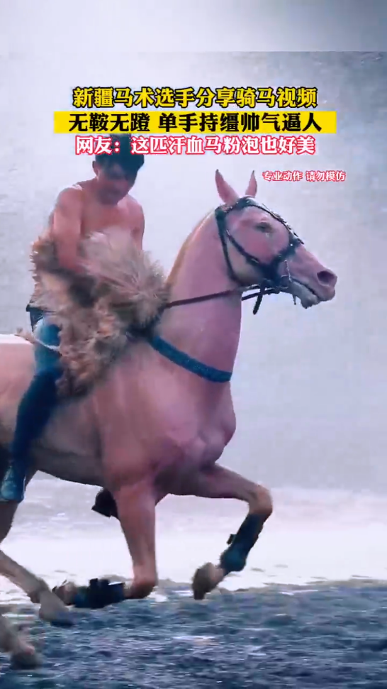 近日,新疆乌鲁木齐,一名马术选手分享身骑汗血宝马的视频。他无鞍无蹬,单手持缰,动作十分娴熟流畅。