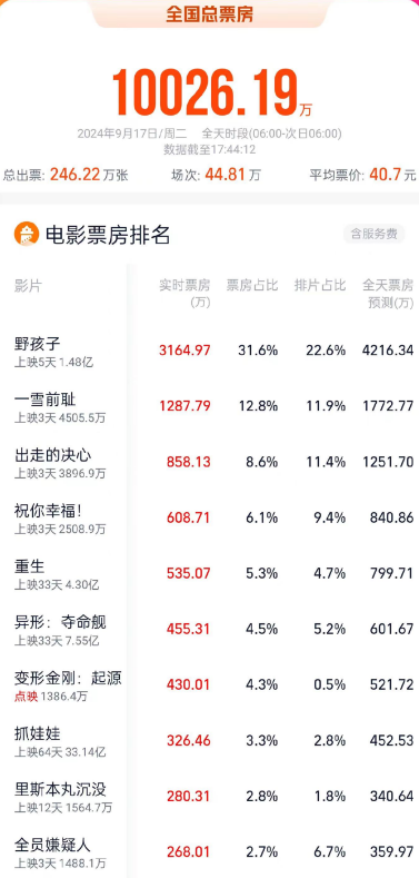 据网络平台实时数据,截至17时44分,2024中秋节当日票房突破1亿!