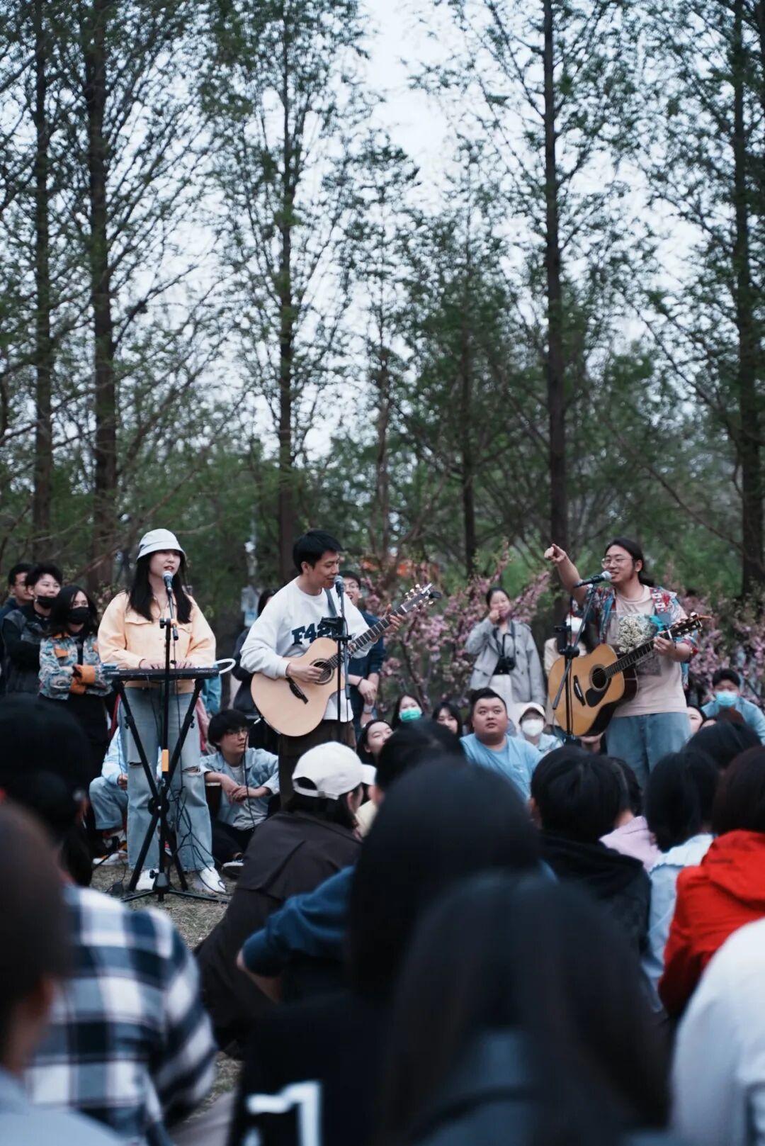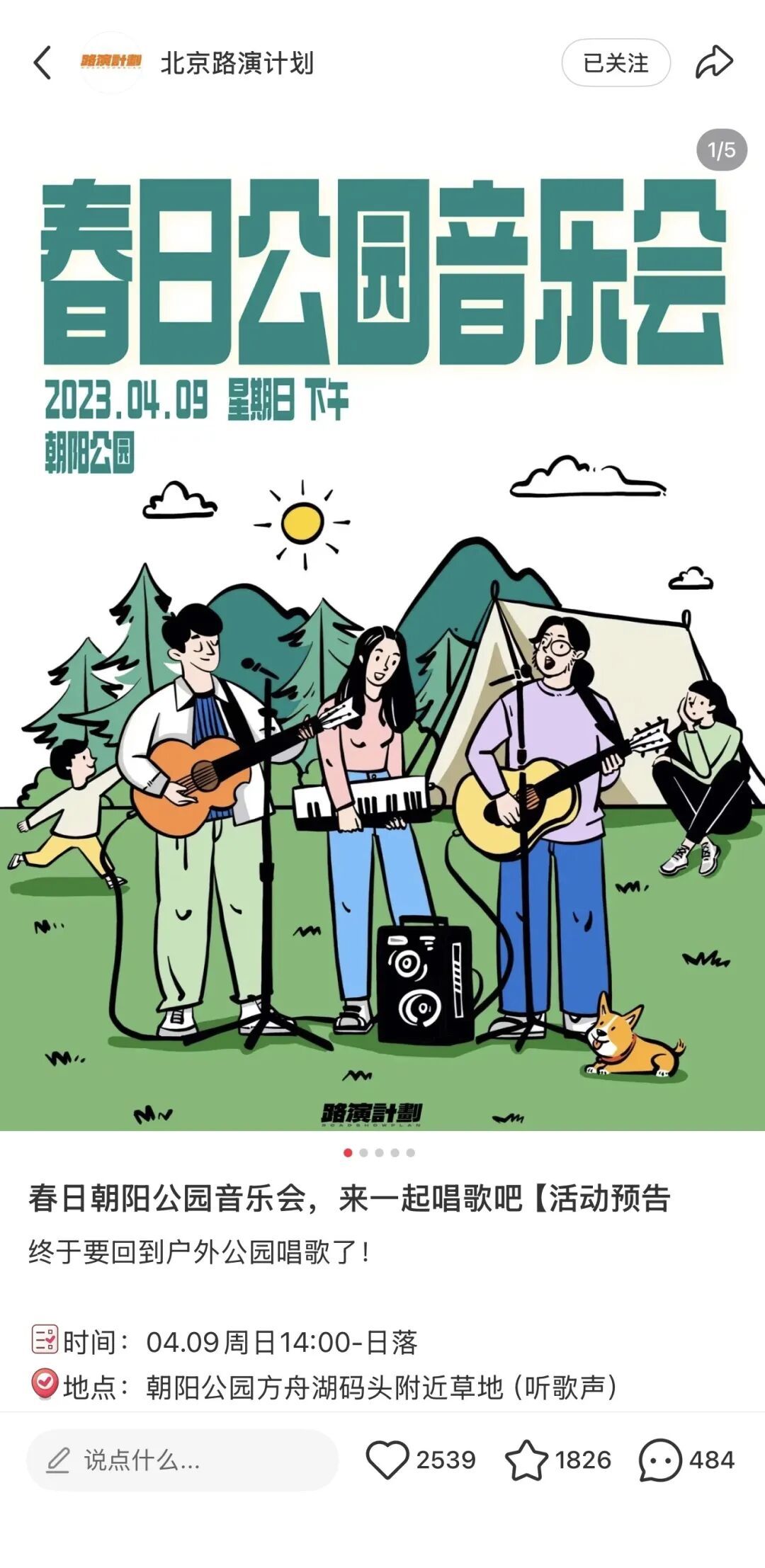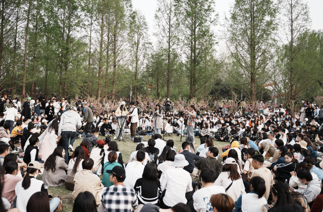 2023年4月9日,一个周日,春暖花开,他们想到朝阳公园方舟湖畔,办一场户外音乐会。在社交平台发布的活动预告里写道,「这是一个自由开放的活动,坐着躺着站着随便,话筒是开放的,想唱歌直接来,我们给你伴奏。」