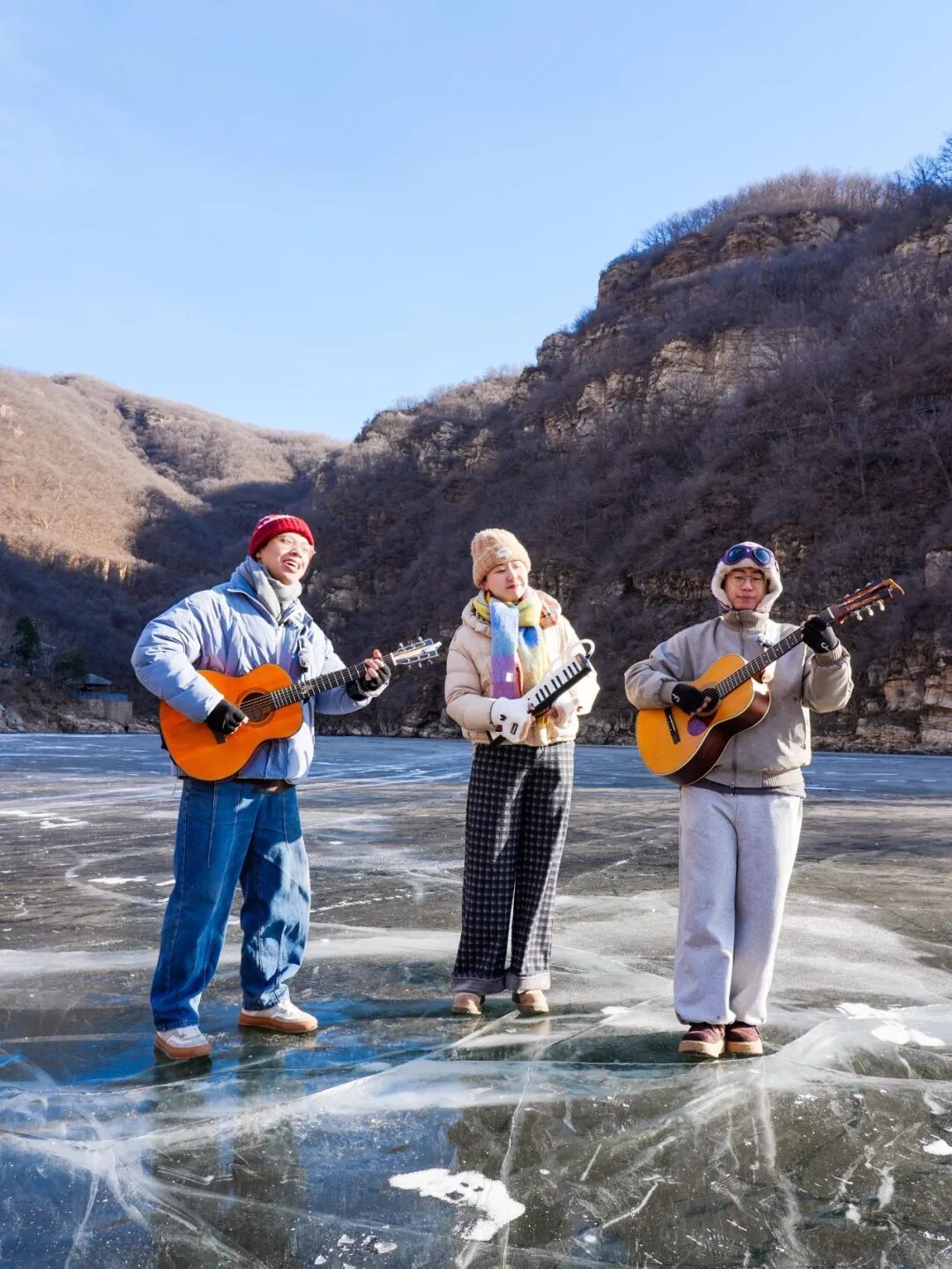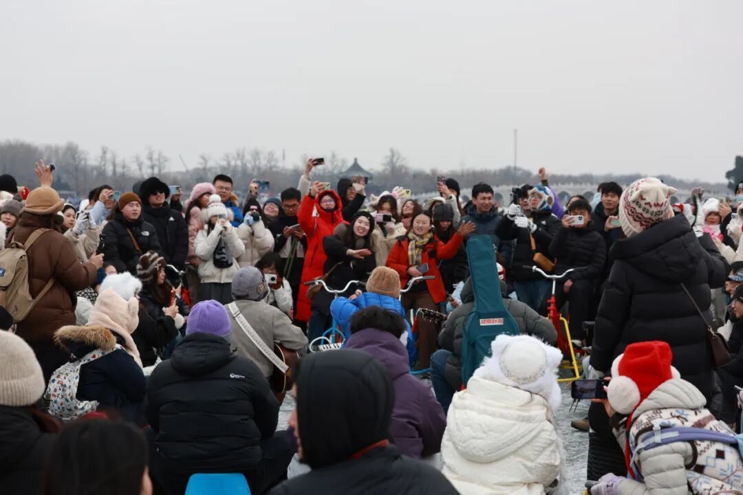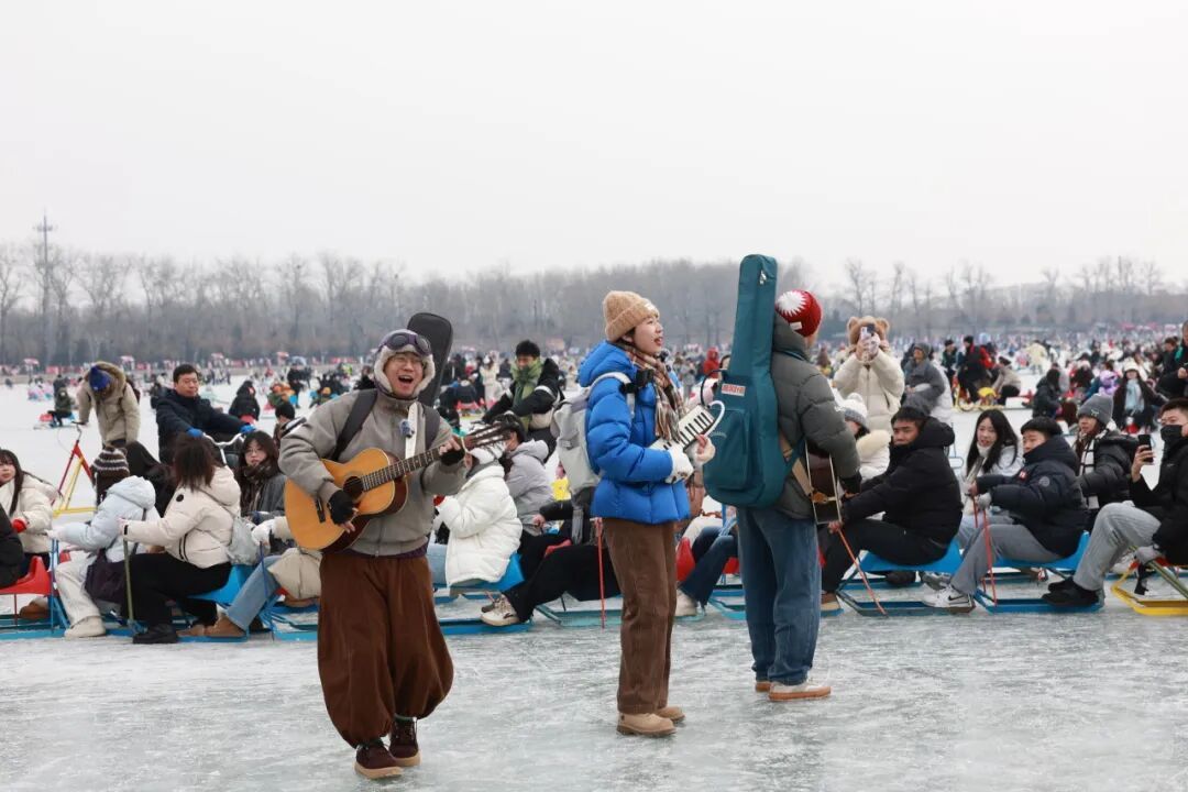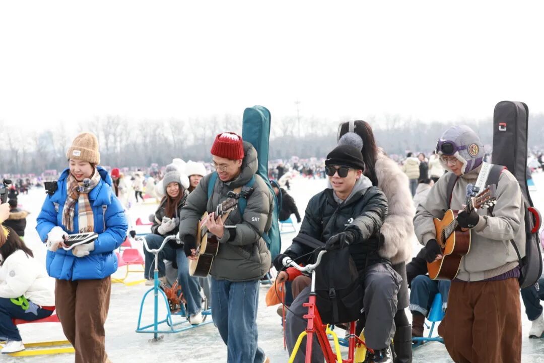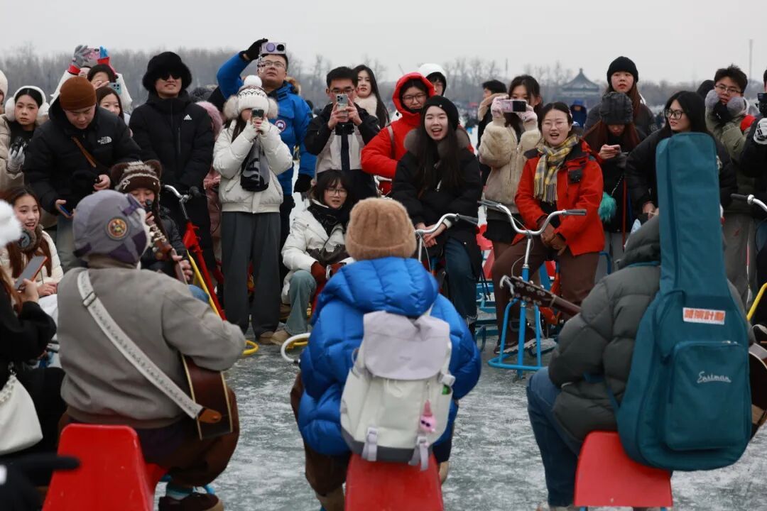 没有舞台,没有音响,谭武、张潇覃和靓仔随着人群,边走边弹边唱,《晴天》《稻香》《忽然之间》《愿爱无忧》......一首接一首,歌声在开阔的冰面上荡开。