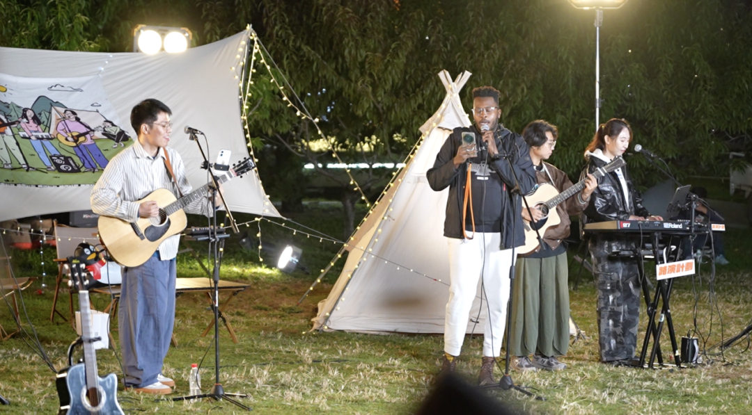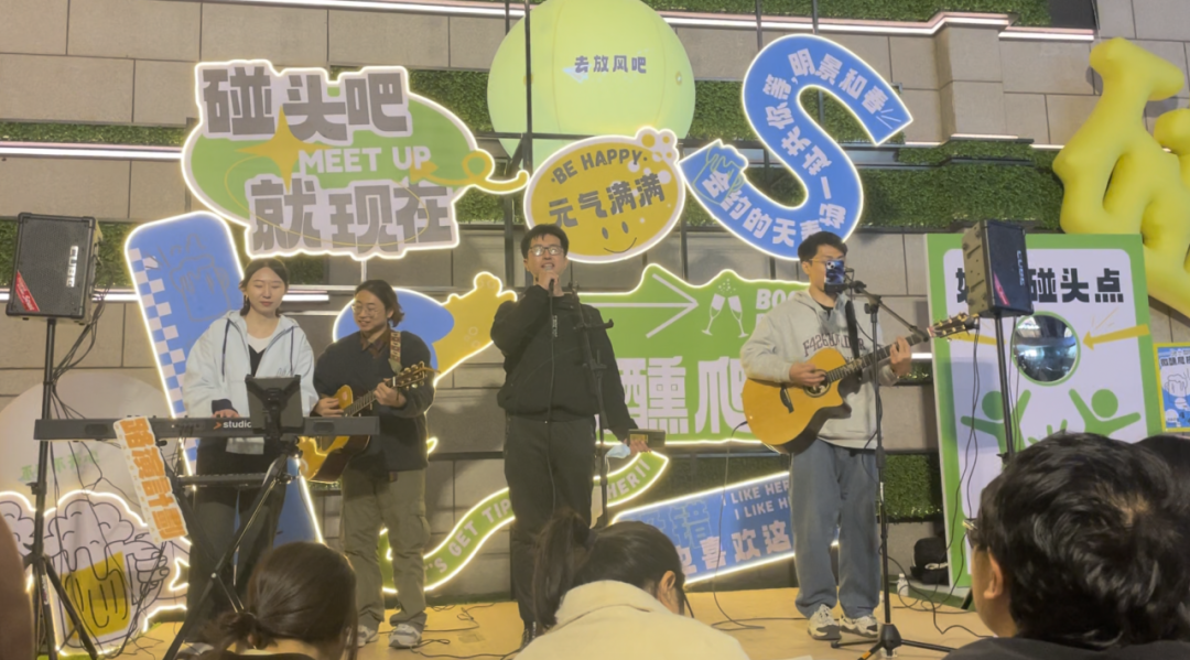 这个环节开始得很偶然。最早在望京SOHO的路边,几个人唱累了,就招呼围观的朋友「你来唱一首吧,我们伴奏」,这个互动被保留至今,成了最动人的部分之一。