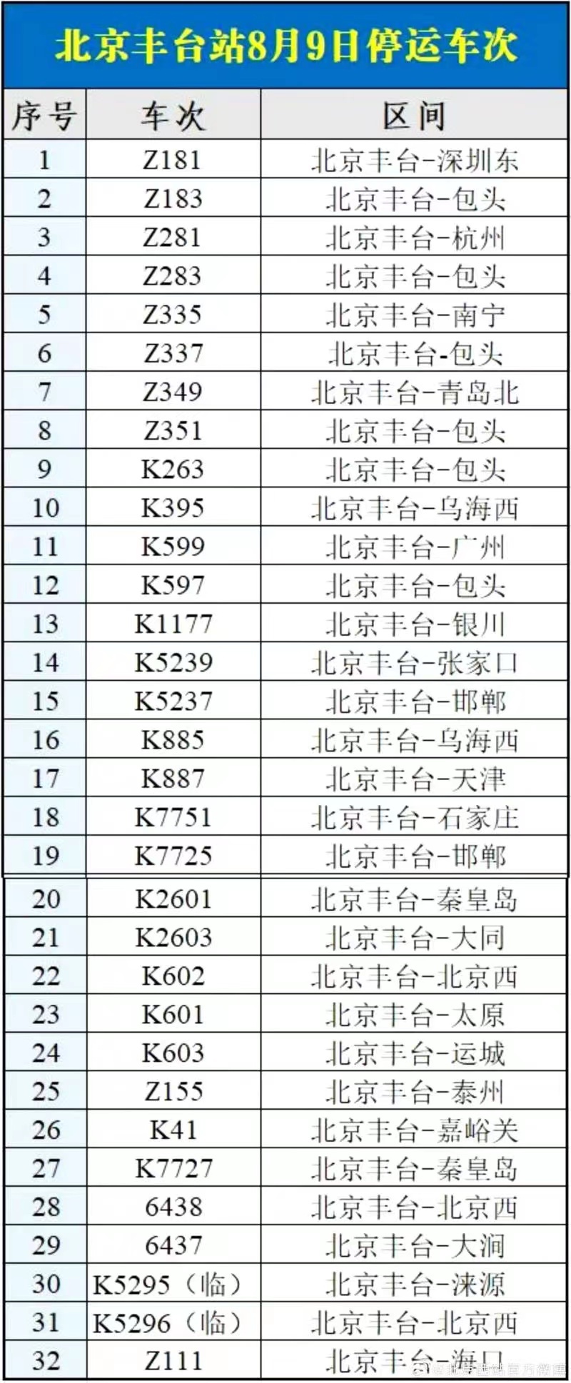 受水害影响,8月9日北京西站、北京丰台站部分列车停运,已购买停运列车车票的旅客,可于30日内办理全额退票手续。请广大旅客合理安排出行,关注铁路部门公告。