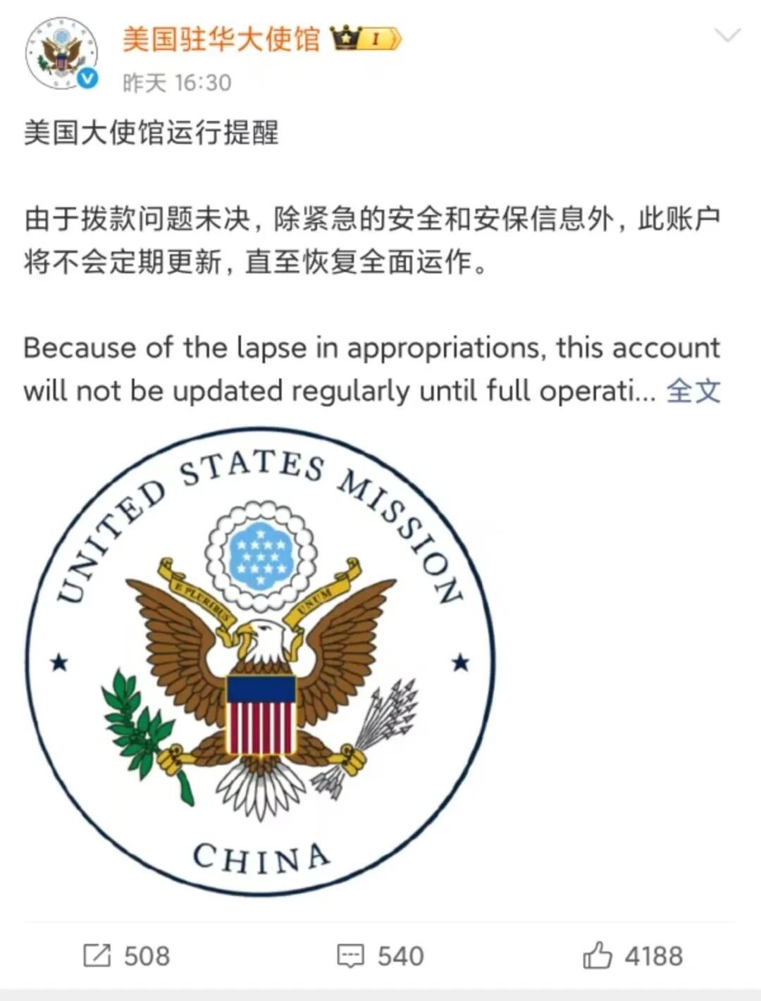 10月7日16时30分,美国驻华大使馆官方微博也发布了同样的“运行提醒”,由于拨款问题未决,除紧急的安全和安保信息外,该账户将不会定期更新,直至恢复全面运作。