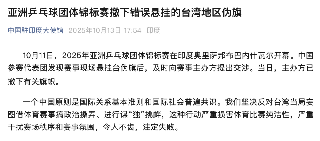 0月13日,中国驻印度大使馆发布消息称,亚洲乒乓球团体锦标赛撤下错误悬挂的台湾地区伪旗。