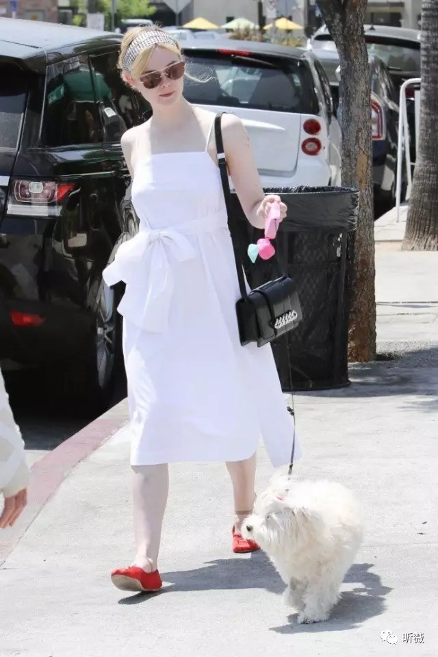 而另外一个时间段,小仙女带着自家汪星人外出压马路,同样也是一身白色吊带长裙,用黑白条纹的发带和红色平底鞋点缀,时尚度满分!