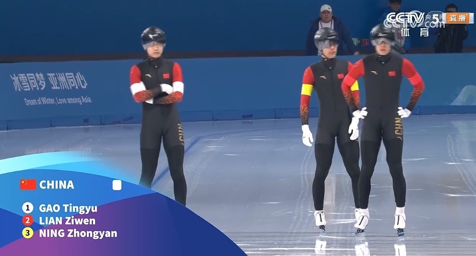 2月10日,哈尔滨亚冬会速度滑冰男子短距离团体追逐决赛,中国队夺得金牌。