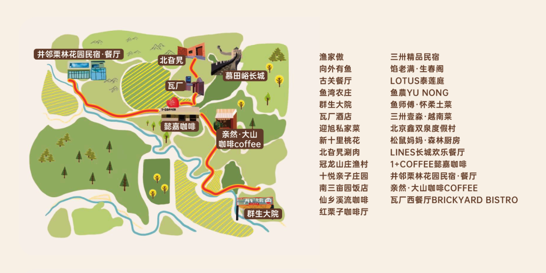 慕田峪美食线路位于慕田峪长城景区南侧,总长11公里,以群生大院为起点、北旮旯涮肉为终点,其中北沟村附近最具国际范。线路不仅集合了十里桃花、向外有鱼、渔家傲、亲然·大山咖啡、十悦亲子庄园等本地特色十足的门店,还囊括了三卅、瓦厂、壹淼 ·越南菜、北旮旯涮肉、红栗子咖啡等兼具时尚国际范的网红打卡点位。