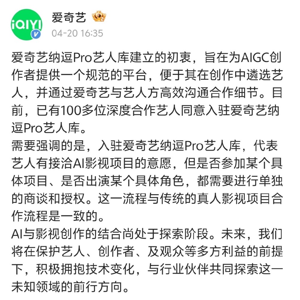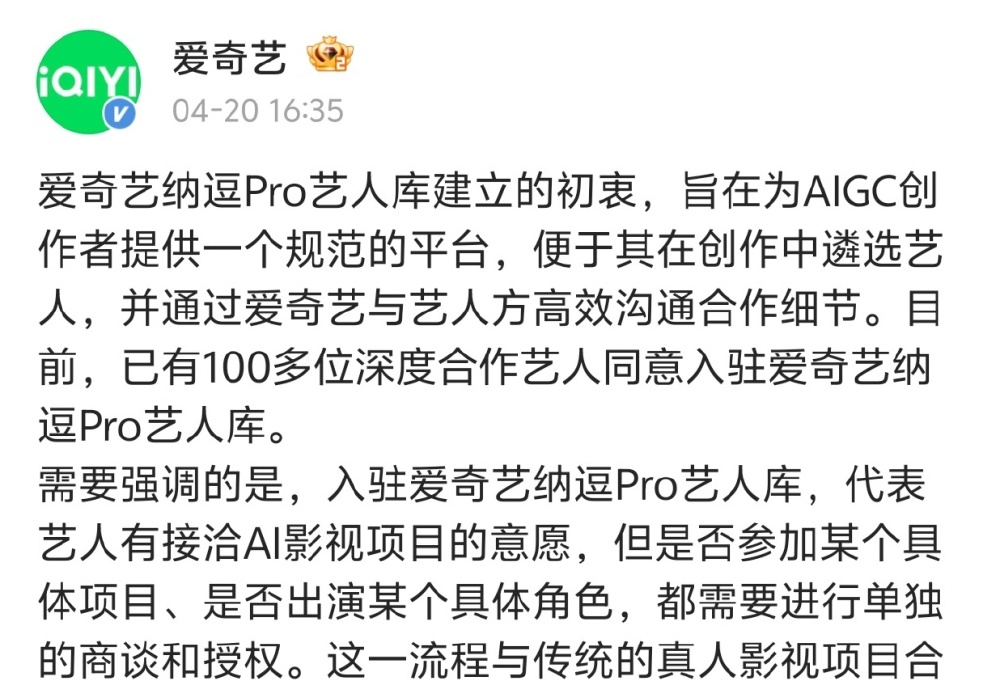 引发轩然大波后,爱奇艺发文回应称“建立纳逗Pro艺人库的初衷,旨在为AIGC创作者提供一个规范的平台,便于其在创作中遴选艺人,并通过爱奇艺与艺人方高效沟通合作细节”。同时强调,“入驻爱奇艺纳逗Pro艺人库,代表艺人有接洽AI影视项目的意愿,但是否参加某个具体项目、是否出演某个具体角色,都需要进行单独地商谈和授权。这一流程与传统的真人影视项目合作流程是一致的。”