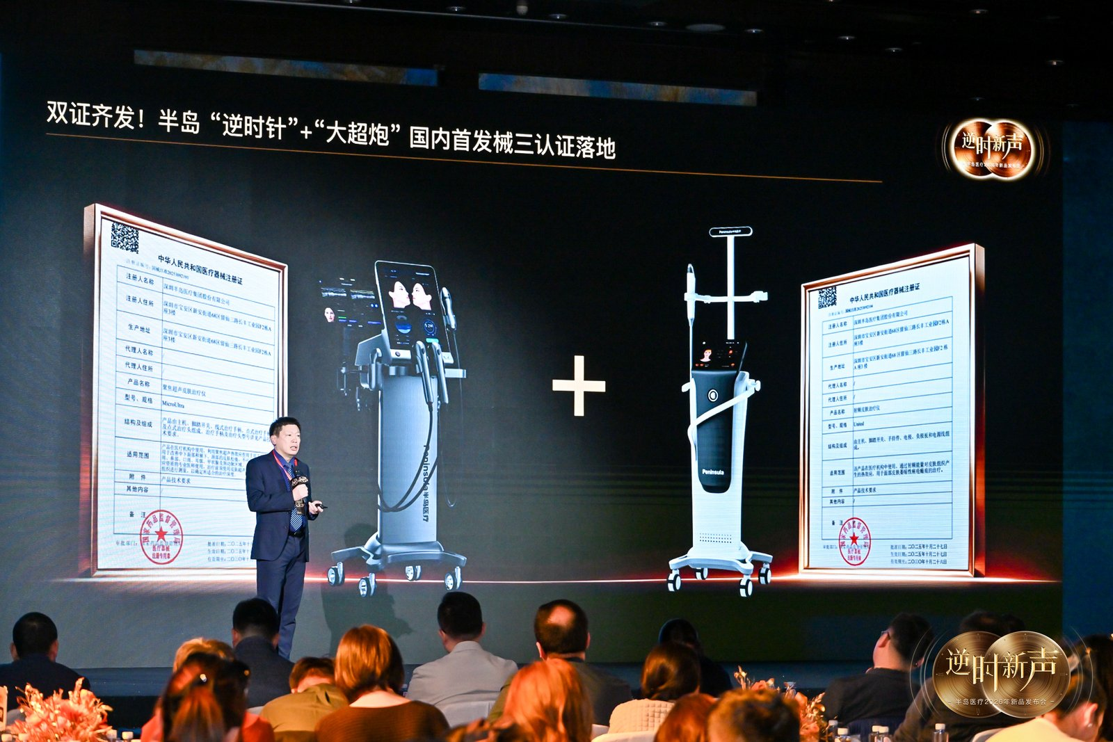 1月7日,半岛医疗在北京新品发布会上,发布两款获得国家药品监督管理局(NMPA)III类医疗器械注册证的产品:半岛大超炮与半岛逆时针射频皮肤治疗仪。