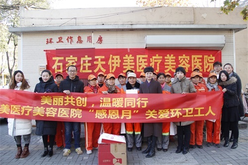 2017年11月23日,时值寒冷的小雪节气后,在裕华区谈固西街环卫工人休息室门前,天伊美医疗美容医院院长杨秀、办公室主任何雯携数名医院职工在此举办了“感恩环卫工,寒冬送温暖”活动,为这里的三十余位环卫工人代表送来了饱含温暖与关怀的防雾霾口罩、护手霜、保暖手套等价值数千元的御寒防霾物资;同时带领天伊美员工走上街头,用实际行动向辛勤劳动的“城市美容师”们致敬。温馨的活动氛围,给寒冷的石家庄街头增加了一份温暖和阳光。