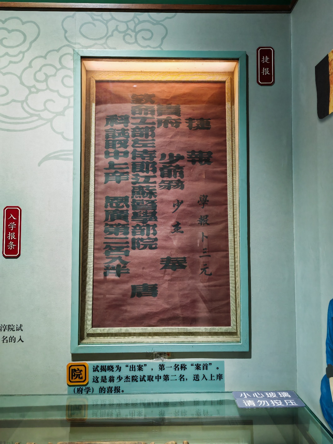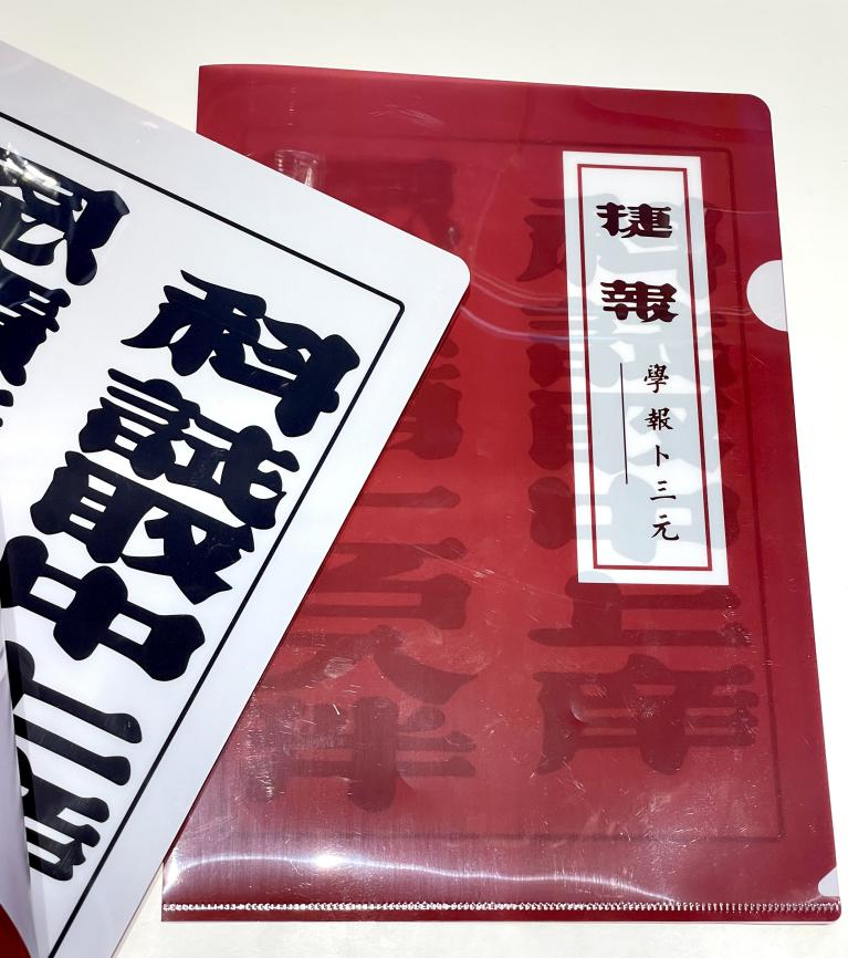 设计内容取自孔庙和国子监博物馆科举展馆内展出“捷报”。“学报卜三元”为祝愿连中三元之意,“科试取中上庠 恩广第二名入泮”意为以第二名考中恩科,准入府学读书,表达了考生被理想学府录取之意。捷报文件夹依照此件展品,祝愿学子们以“第一名入泮”。