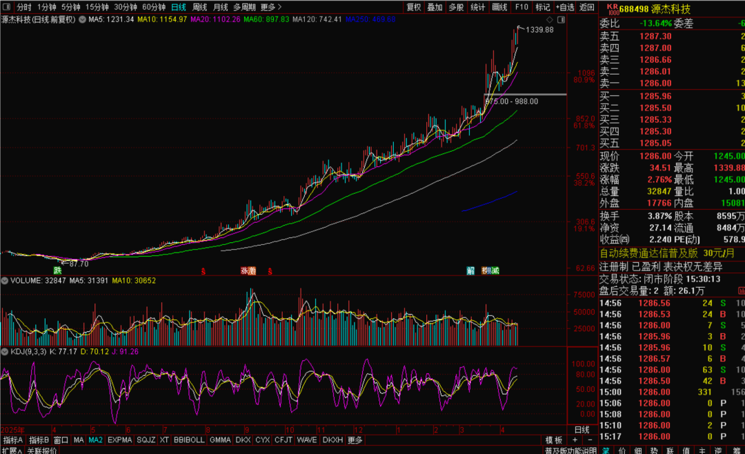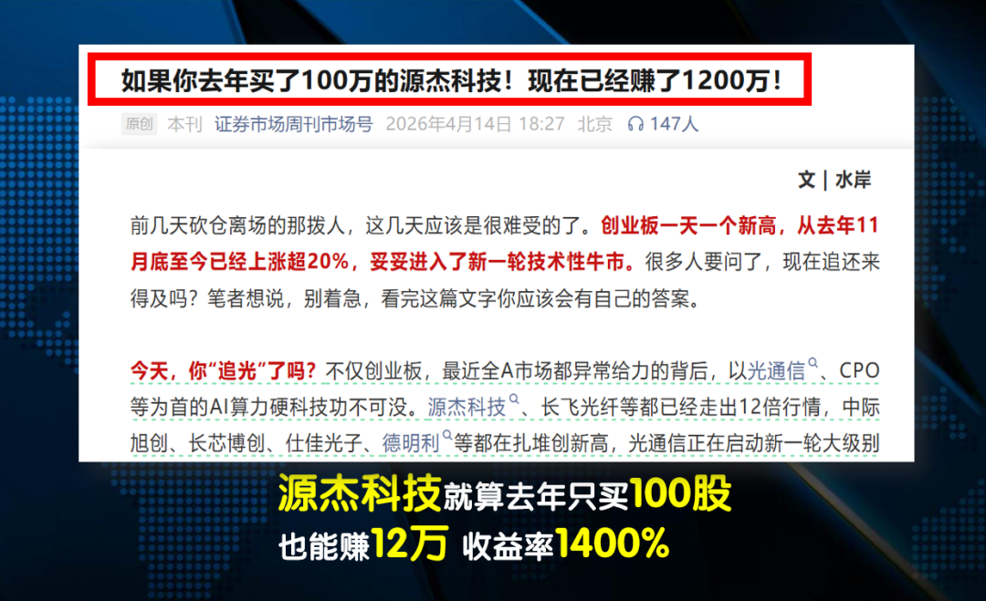 高速光芯片龙头源杰科技今天又创了历史新高,这只股票,从去年的87元,一年的时间涨到了1322元。于是网上就有了这样的文章,标题是“如果你去年买了100万的源杰科技!现在已经赚了1200万!”