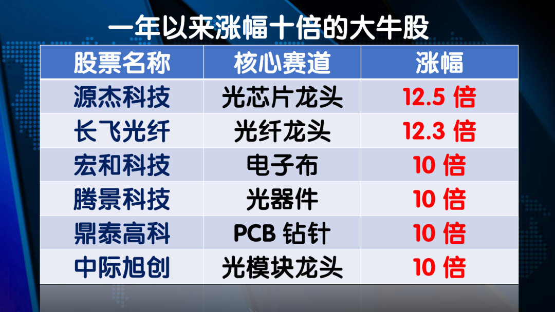 我们梳理了一年以来涨幅十倍的大牛股: