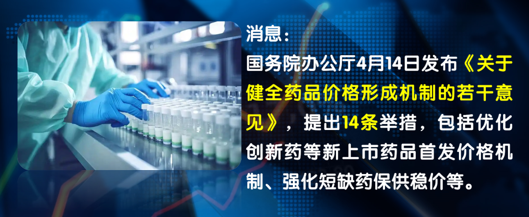 国务院办公厅4月14日发布《关于健全药品价格形成机制的若干意见》,提出14条举措,包括优化创新药等新上市药品首发价格机制、强化短缺药保供稳价等。