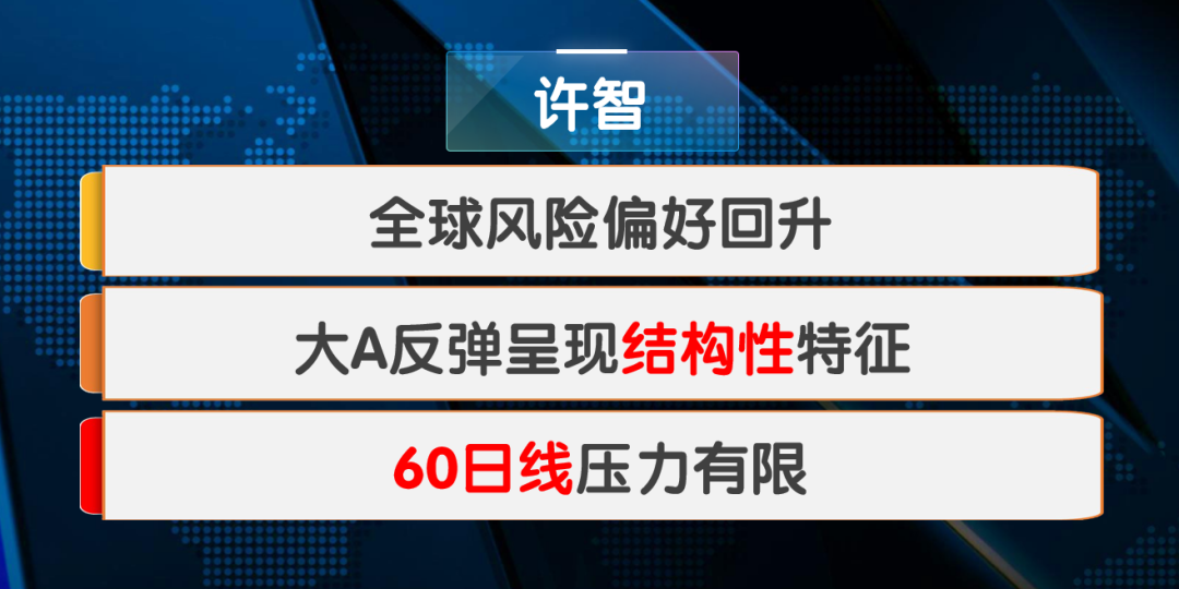 场外嘉宾王旭表示,60日均线压力大、下半月看震荡;宋振宇表示,4100点可期、反弹进入中后段。