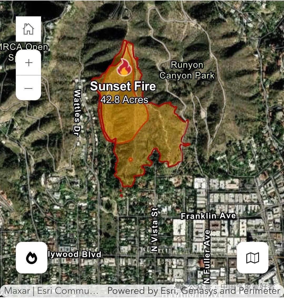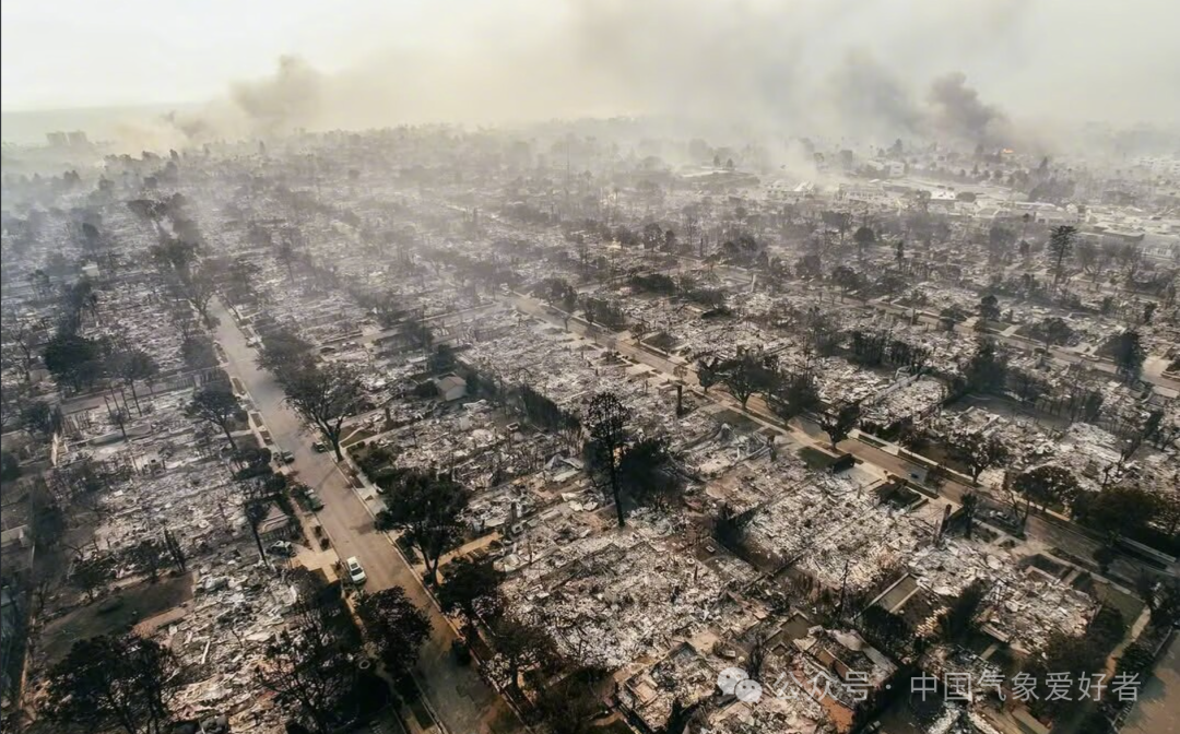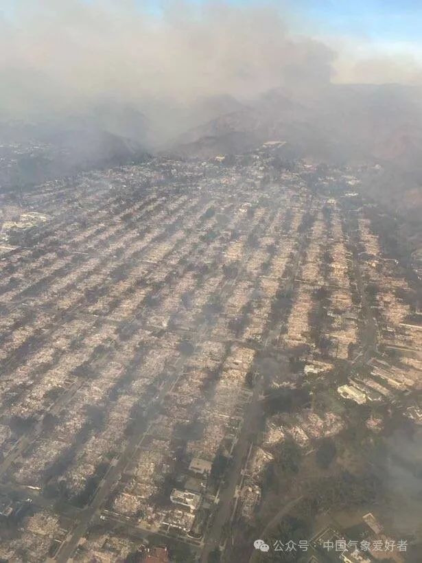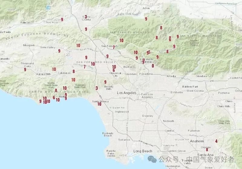 气象监测显示,伯班克机场附近最大风力达到13级,山区最大阵风达到了14级。在焚风吹袭期间,洛杉矶各地相对湿度降到12%甚至10%以下。这应该是洛杉矶附近地区的历史最强焚风之一。而正是在极端干旱和极端焚风的共同作用下,这场极端山火发生。