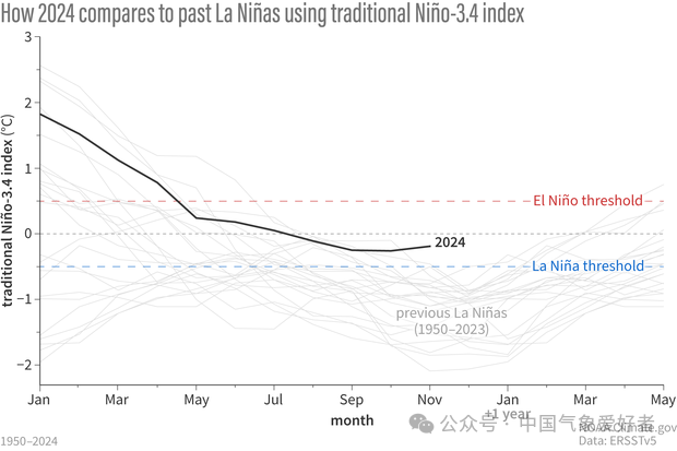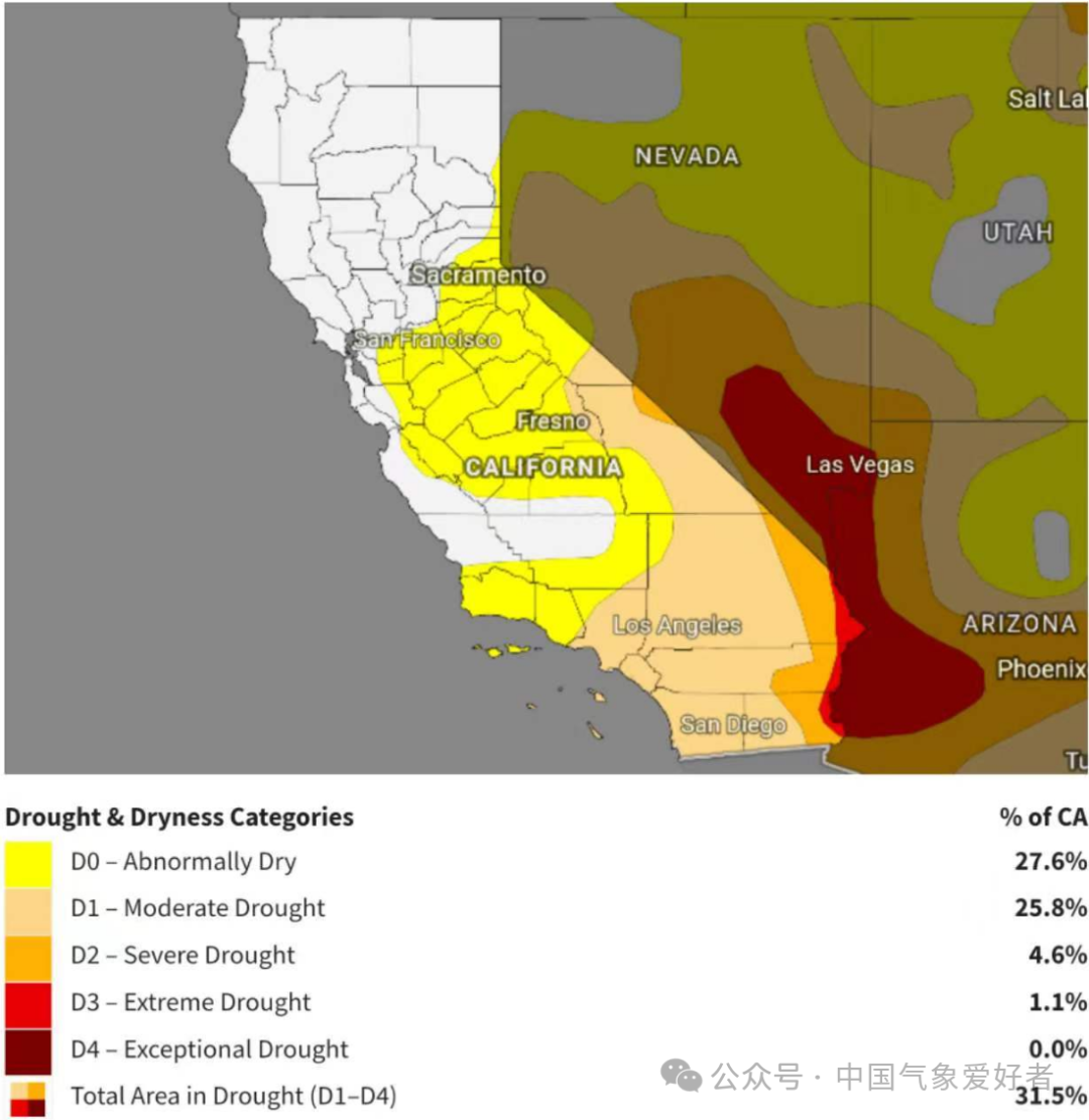 在美国,拉尼娜发生时的冬季,一般呈现降水北多南少的格局。而今年的情况特别符合这个特征,只是表征拉尼娜强度的Nino3.4指数比较弱,但这主要和全球海洋变暖有关。而全球海洋和大气变暖,又让西风急流容易偏北,让加州在宝贵的冬雨季无法获得水汽,极度干燥和干旱。