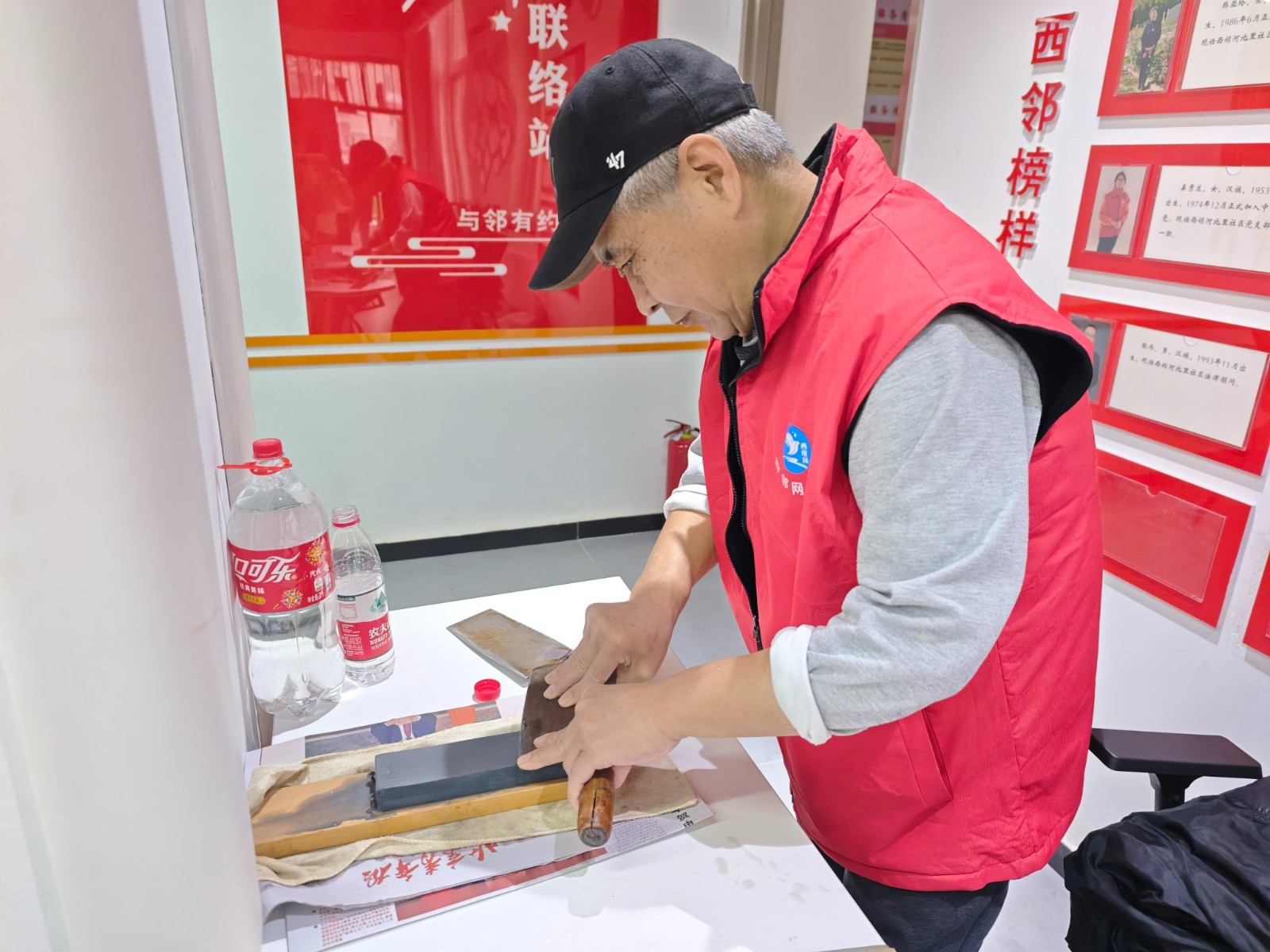 法律咨询区,专业律师“一对一”解答邻里纠纷、财产继承等问题,帮居民增强法律意识。便民服务区,磨刀师傅手法娴熟,将居民送来的旧刀具打磨得锋利如新,还讲解保养技巧;缝纫剪裁志愿者免费修补衣物、改造旧物,缝制小被子,用一针一线温暖人心,尤其贴合老年人需求。
