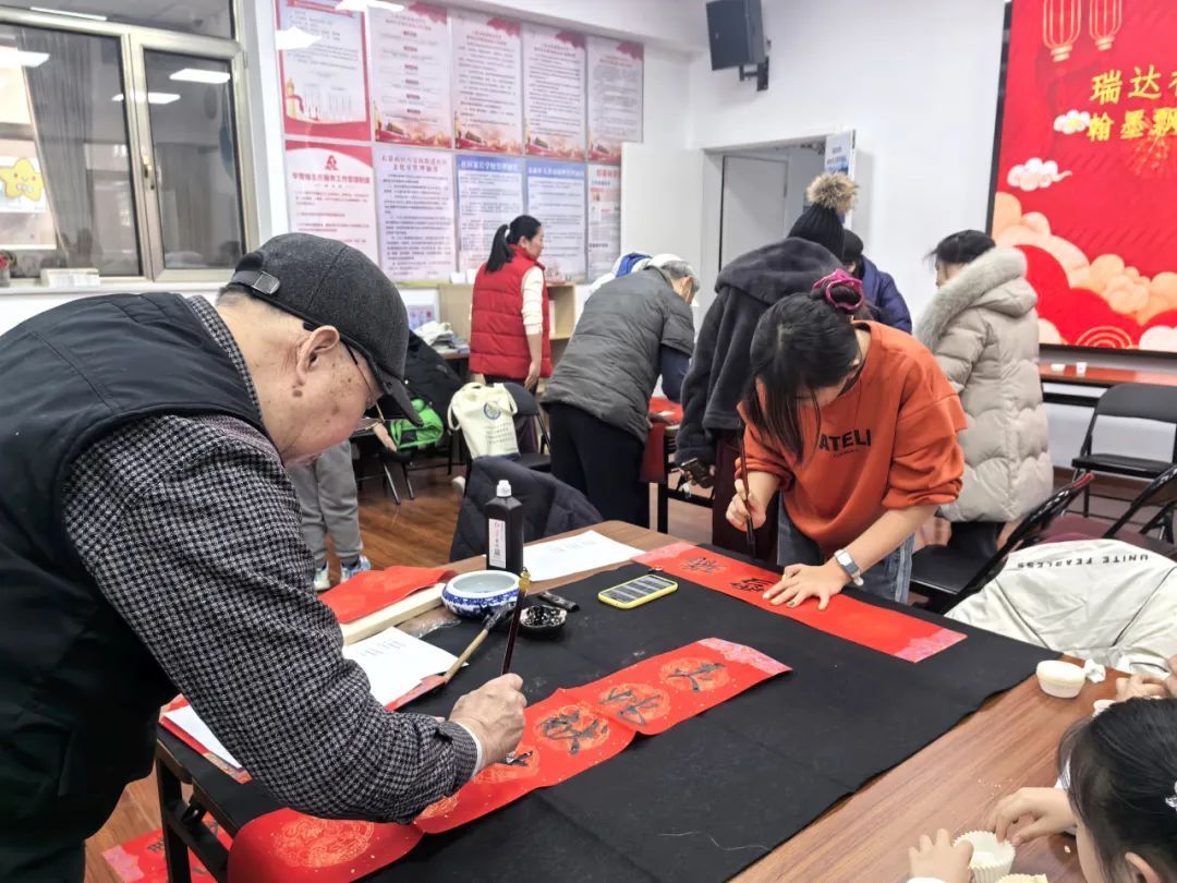 活动现场,红纸翻飞,墨香四溢。书法爱好者们铺开红纸,尽情挥毫泼墨。居民们围坐在一起,有的人磕着瓜子,闲话家常,有的人耐心观摩,细细品读,用手机记录下书法老师写对联的过程,欢声笑语交织着氤氲墨香,新年的喜气弥漫活动室各个角落,每个人脸上都洋溢着开心的笑容,气氛十分欢乐祥和。