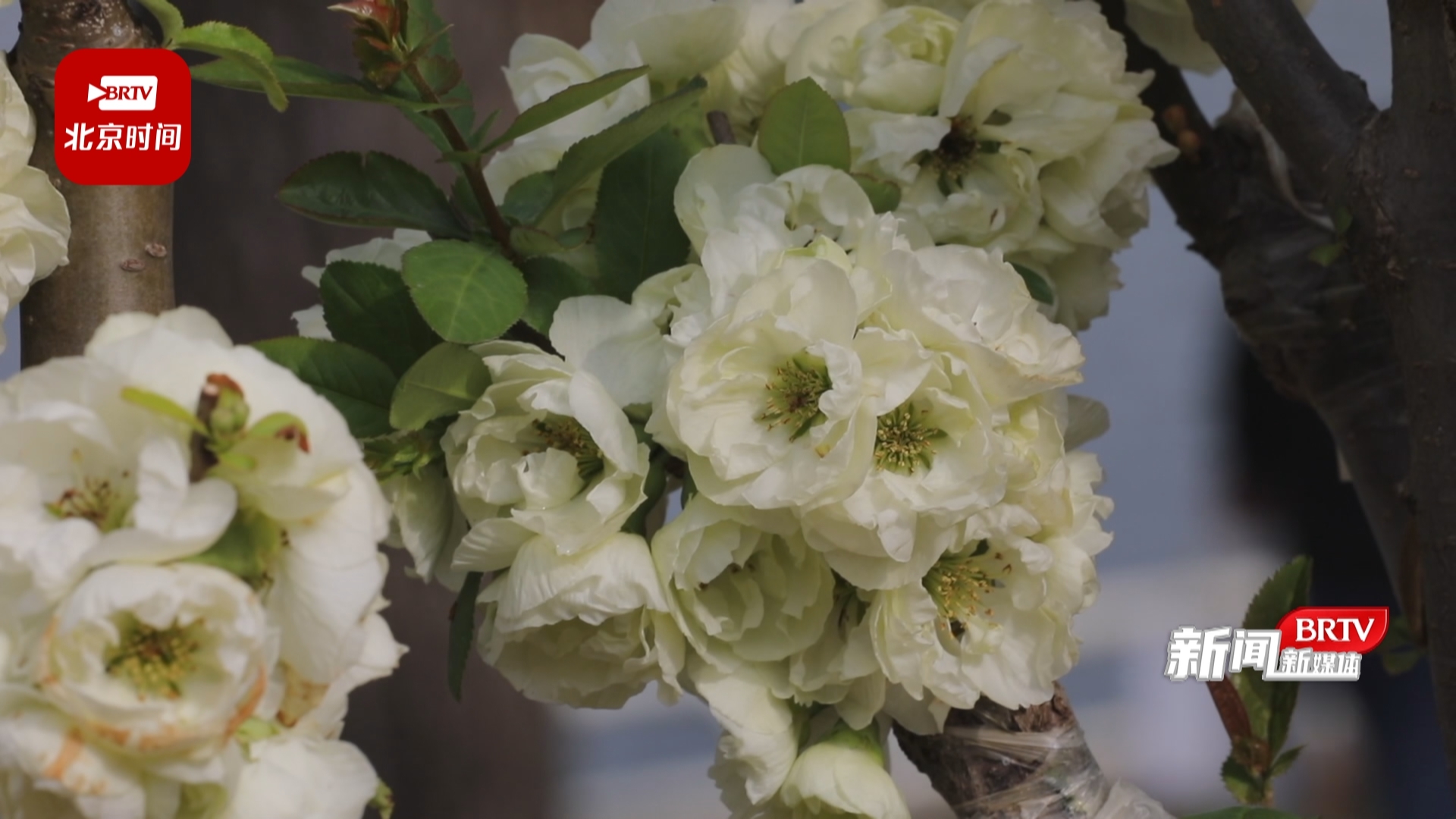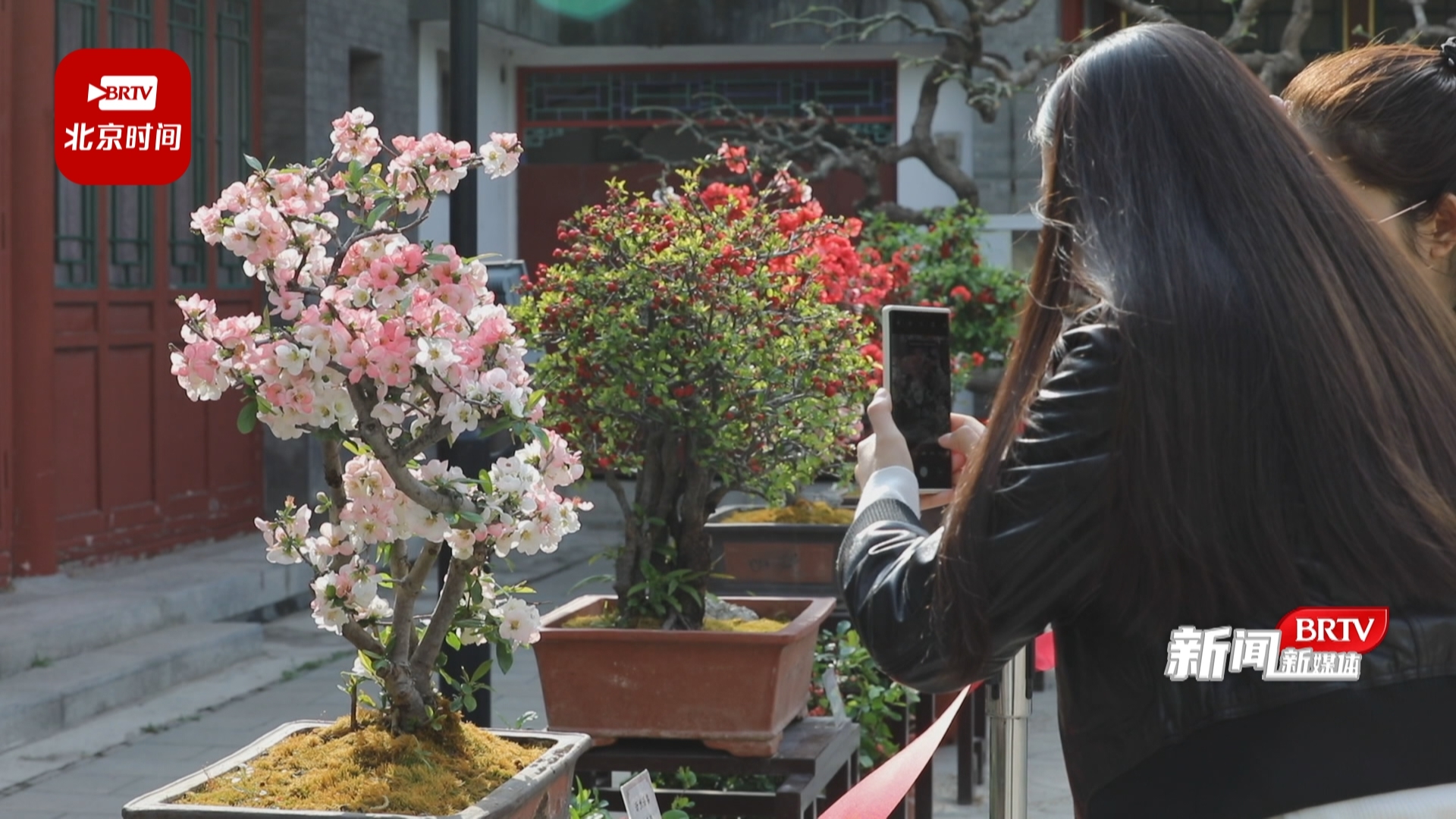 陶然亭公园园林科技科工程师 王萌:“今年新引进的盆景是山东沂州海棠的雪之辉和白寿,雪之辉是一种复色的品种,随着时间推移它是慢慢会有变色的情况,白变粉的状态。白寿整体上是淡绿色的。”