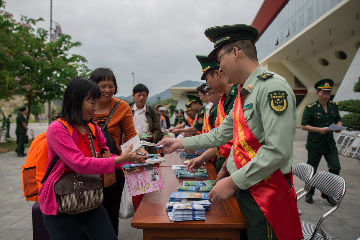 ▲中越两国边检机关工作人员向出入境人员发放宣传资料