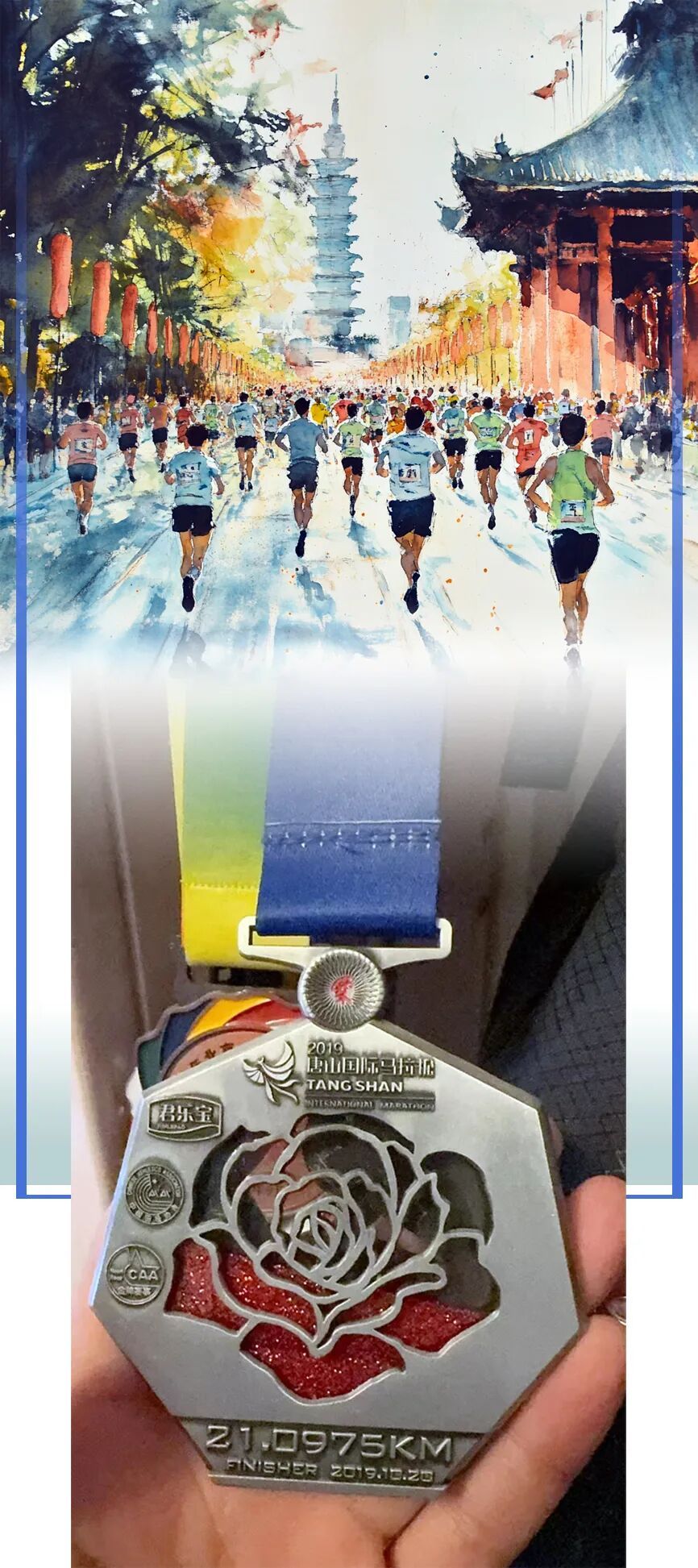 这是2019年10月20日唐山马拉松半程赛事的完赛奖牌,我得到的;