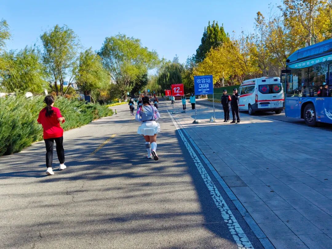 收容车将大家送到了终点,此时,遇到了很多已经完赛的全马和半马的选手,他们脖子上挂着奖牌,手里拎着完赛包,有的甚至还捧着鲜花……