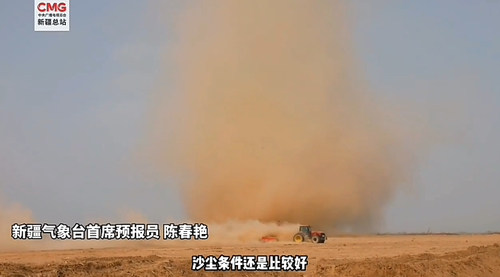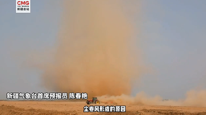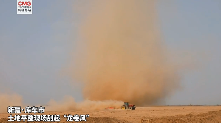 近日,在新疆库车市高标准农田建设项目的土地平整工作现场,刮起了一阵“龙卷风”,平整过的土地尘土被卷起,场面极其壮观。自治区气象局首席预报员陈春艳介绍:热力不均匀造成局地低压环流,导致出现了这样小范围剧烈抬升的上升气流形成的“尘卷风”。之所以形状看起来会这么好,是因为地面的沙尘条件好。