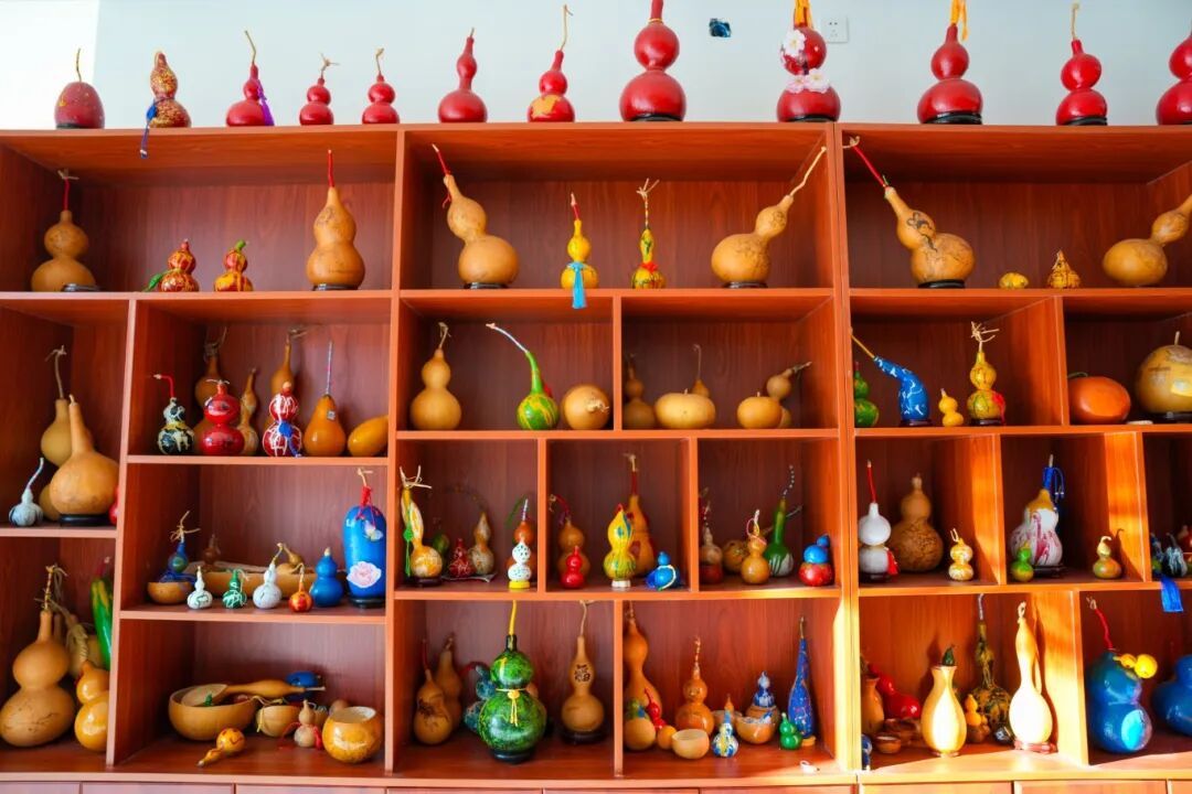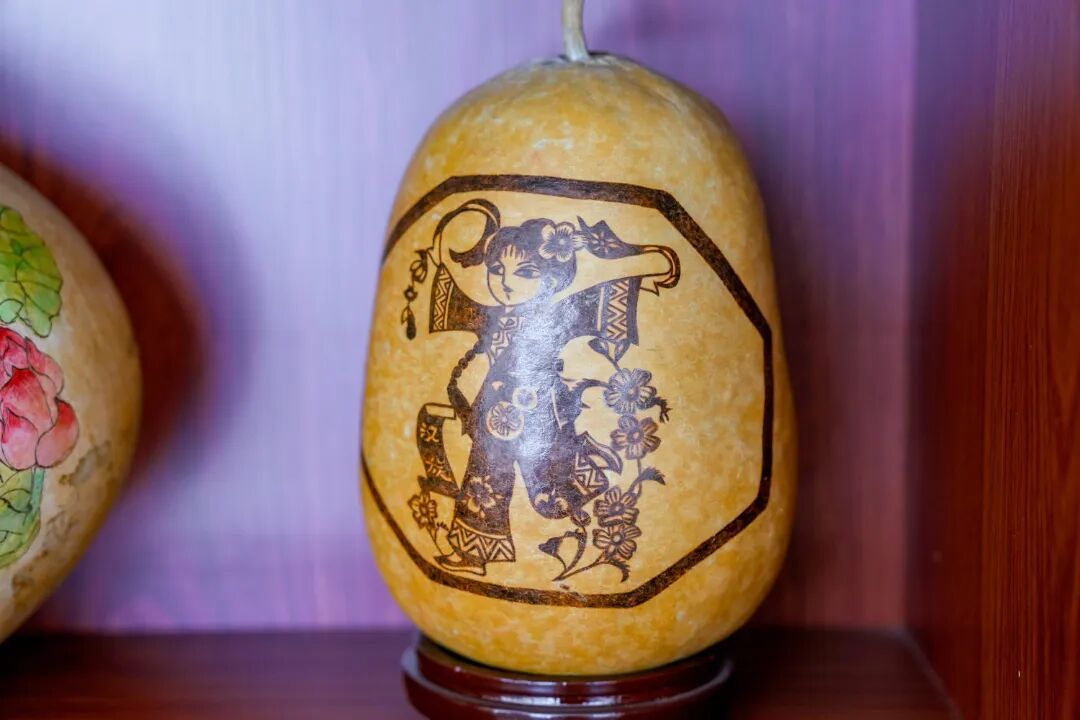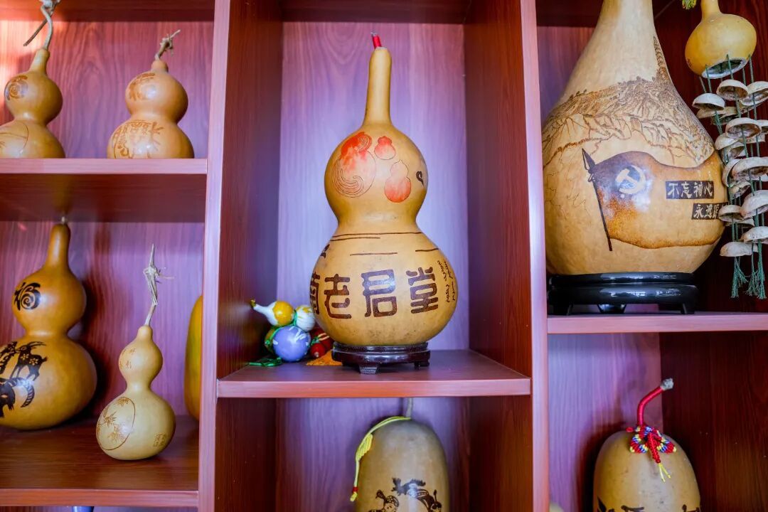在这,手工艺人以火为墨、铁笔生花,运用国画白描、工笔技法,在经过半年风干的葫芦表面烫烙出山水、花鸟、吉祥纹样,焦褐黄白的自然色调层层晕染,每个葫芦都是独一无二的艺术品。