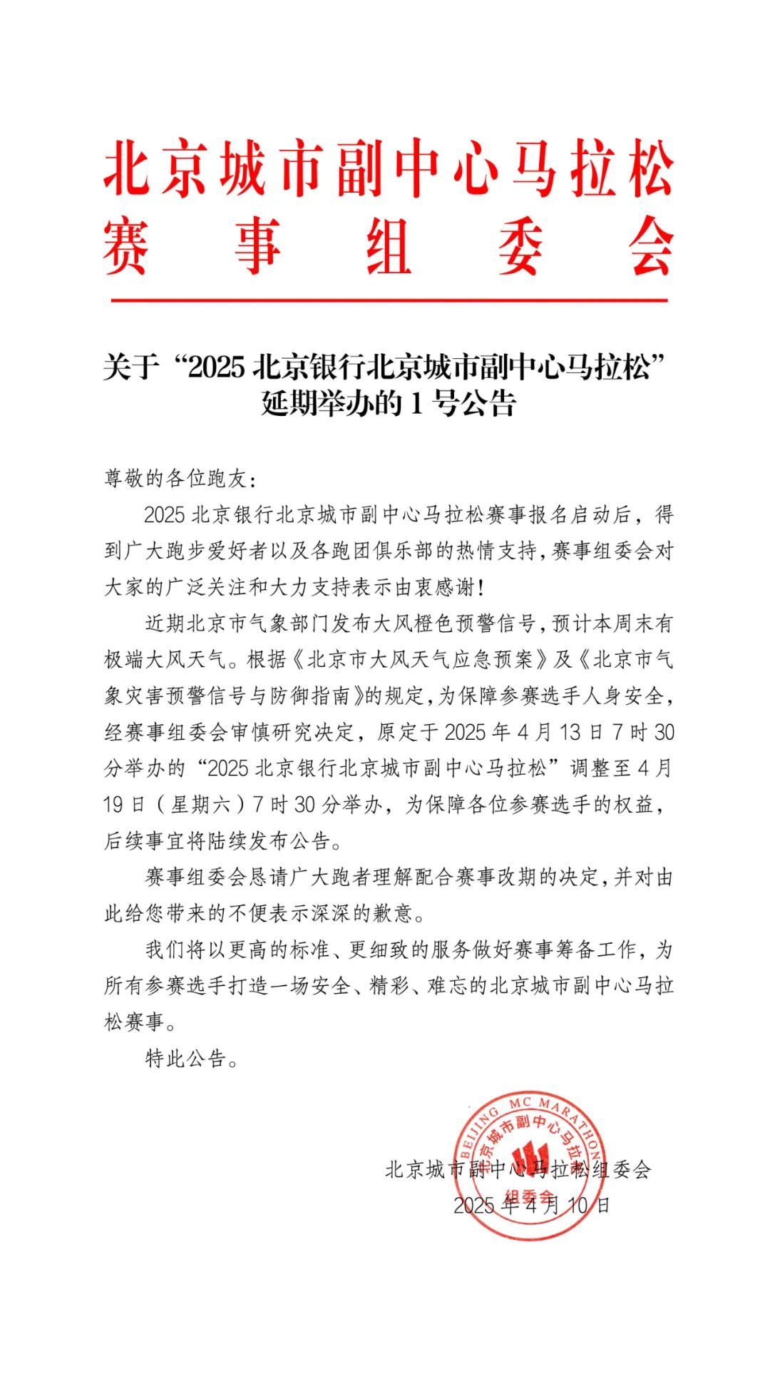 因受大风极端天气影响,为保障参赛选手的人身安全和竞赛体验,原定于2025年4月13日举办的2025北京城市副中心马拉松延期至4月19日举办。为保障比赛的顺利进行及比赛期间道路交通安全畅通,根据《中华人民共和国道路交通安全法》第39条之规定,公安机关交通管理部门将对部分道路采取临时交通管制。