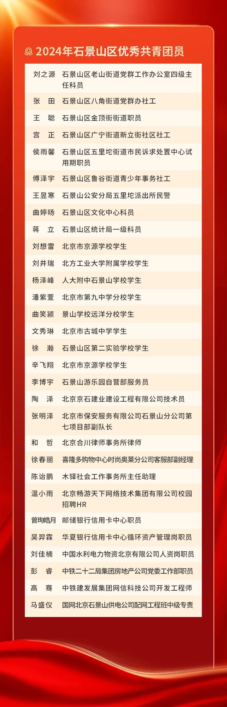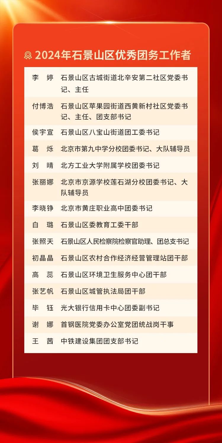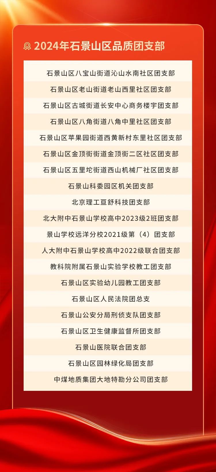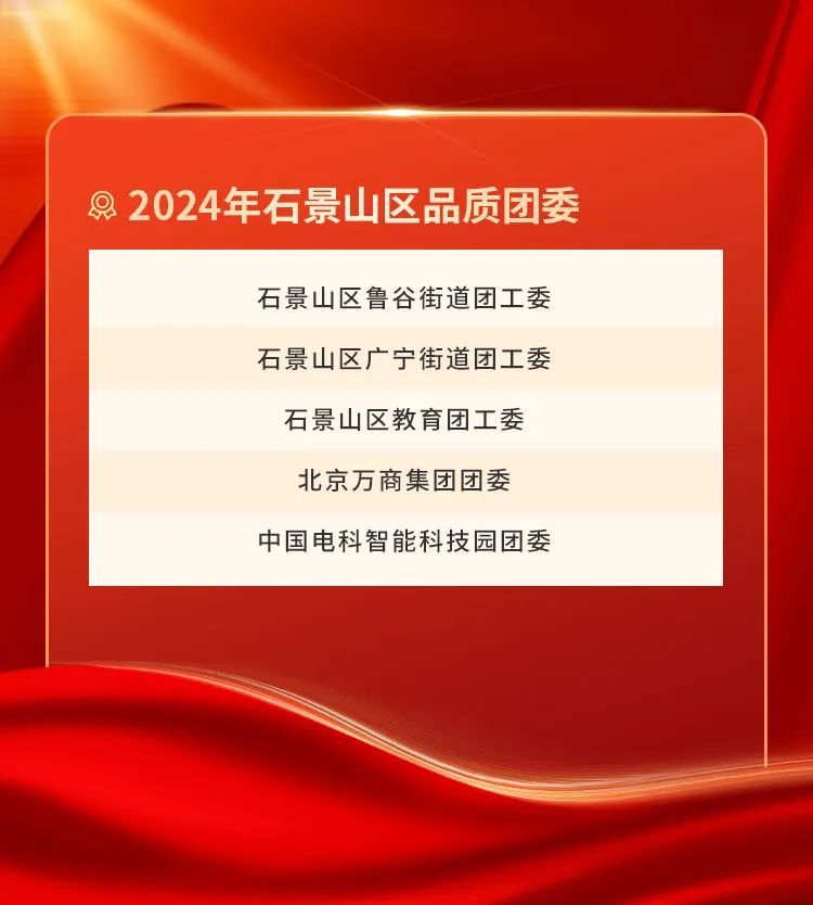 为选树典型、推广经验,助力石景山区“品质先锋”工程建设,近日,共青团石景山区委员会决定认定5个2024年“石景山区品质团委”、20个2024年“石景山区品质团支部”、15名2024年“石景山区优秀团务工作者”、30名2024年“石景山区优秀共青团员”。