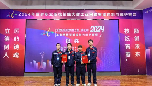 由智能制造学院尹静文、郑小慧教练团队指导的窦伟堂、郭鹏、原嘉伟、刘法照团队获工业网络智能控制与维护组赛项银奖。