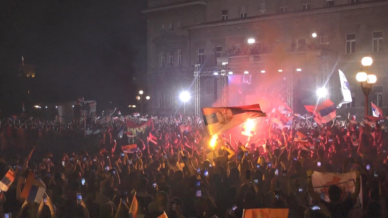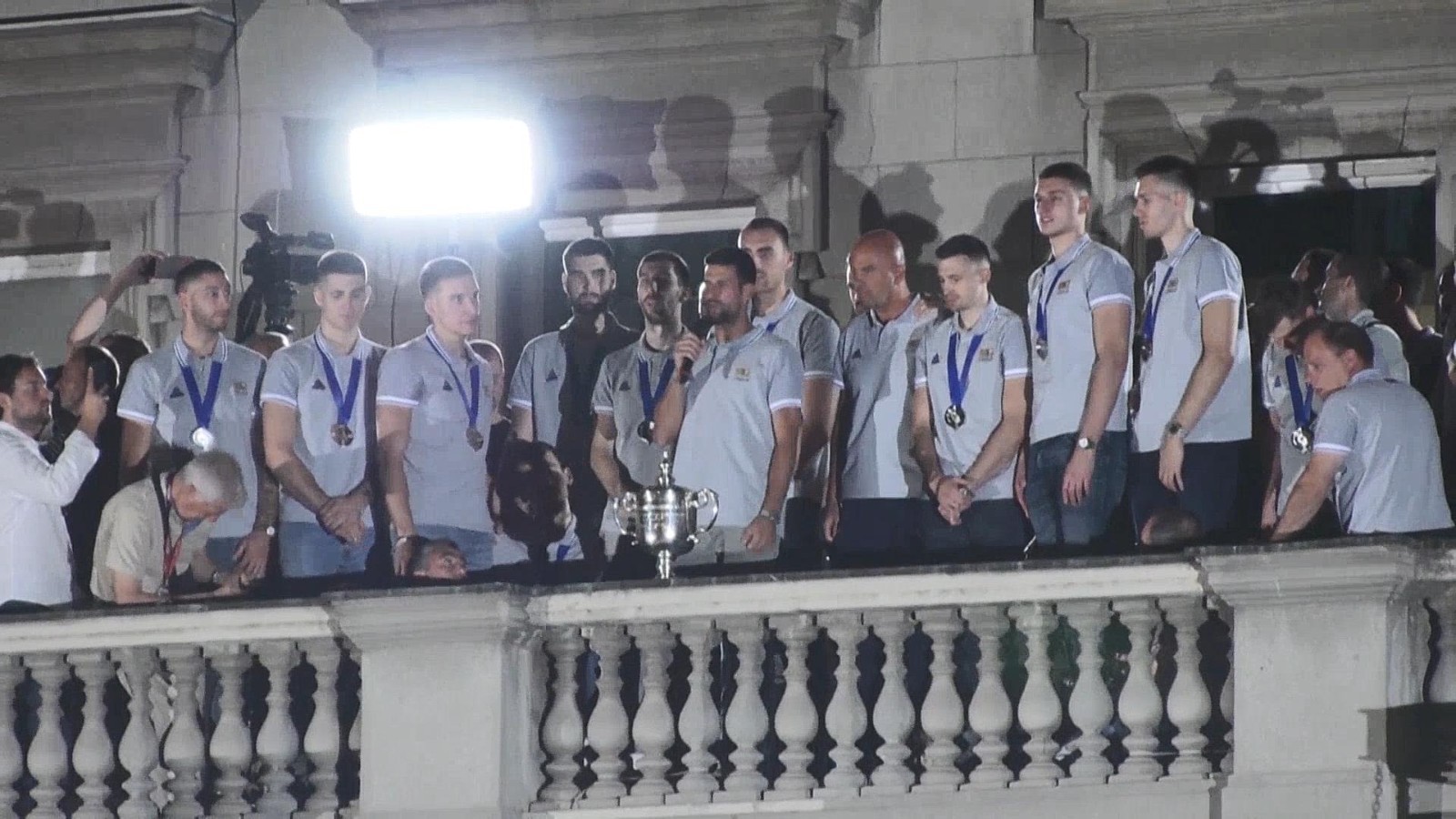 世界杯决赛结束后,数千名球迷聚集在贝尔格莱德市中心,挥舞着塞尔维亚国旗,点燃火炬,欢迎国家篮球队归来。刚刚拿下职业生涯第24座大满贯冠军奖杯的塞尔维亚网球运动员德约科维奇也加入到庆祝仪式中。